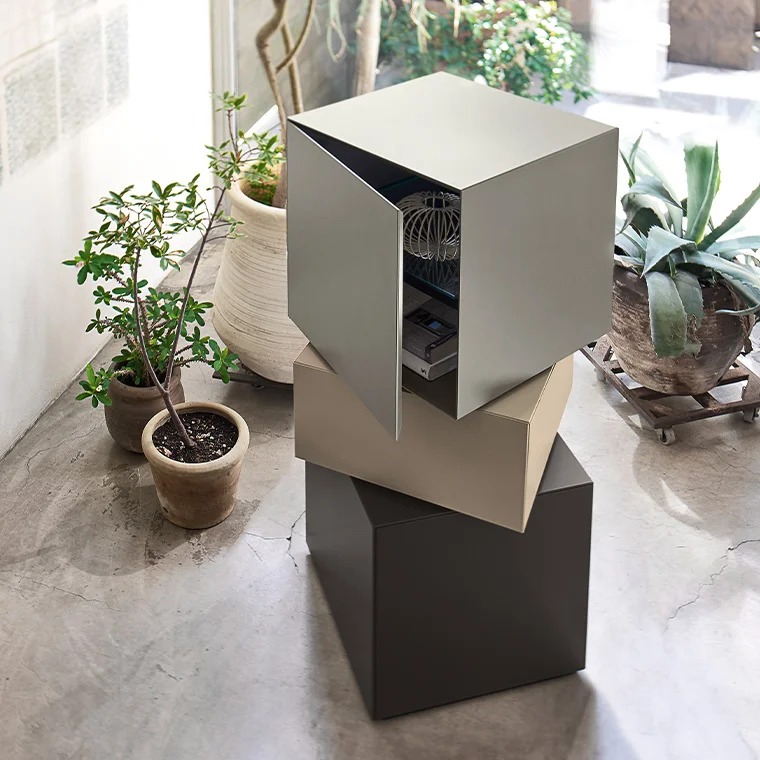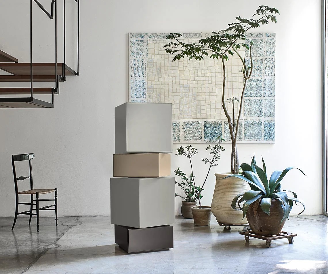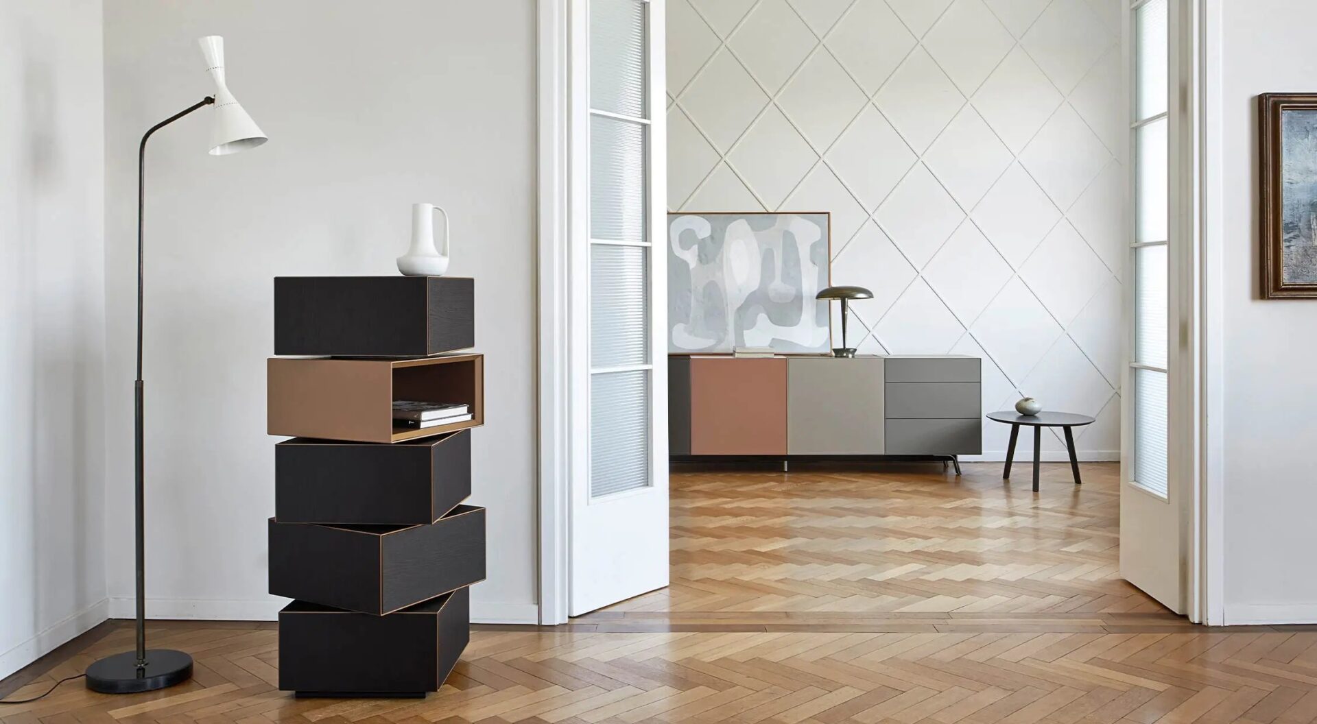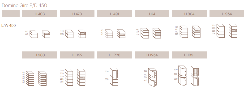 Динамичный и своеобразный, Domino Giro отличается перекрытием отдельных элементов с ящиками, открытыми или дверными отсеками разной высоты (H 150 / 225 / 450 мм), но с одинаковой шириной и глубиной (450 мм), поэтому их можно вращать и использовать со всех четырех сторон.