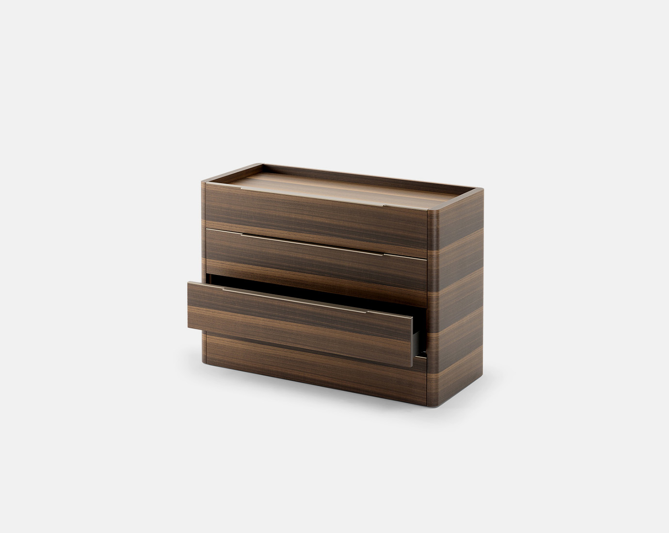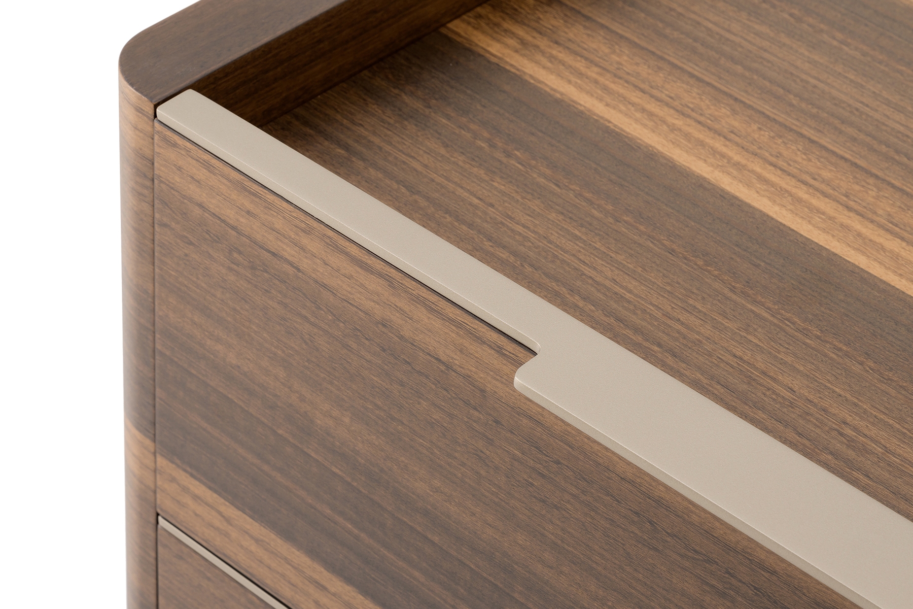 Итальянский комод Domus от фабрики TURRI — воплощение элегантности и безупречного дизайна. Изящные формы выдвижных ящиков подчеркнуты изогнутыми углами и длинными ручками с плавными металлическими линиями. Корпус и столешница выполнены из благородного эвкалипта, а детали — из матового светло-платинового металла, что придает комоду современный и стильный вид.