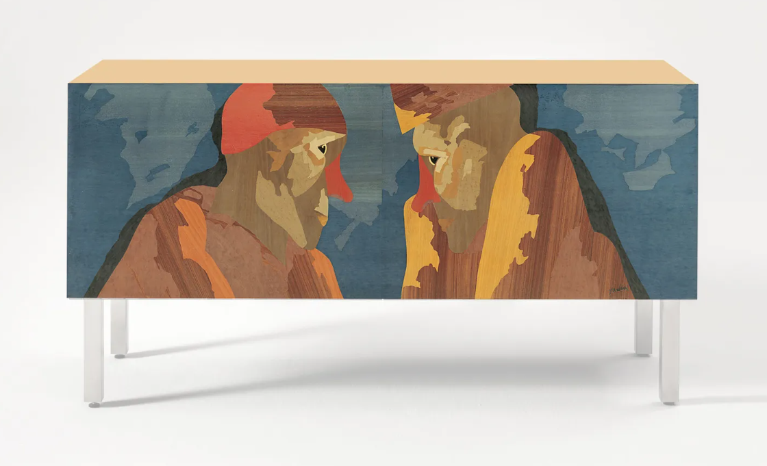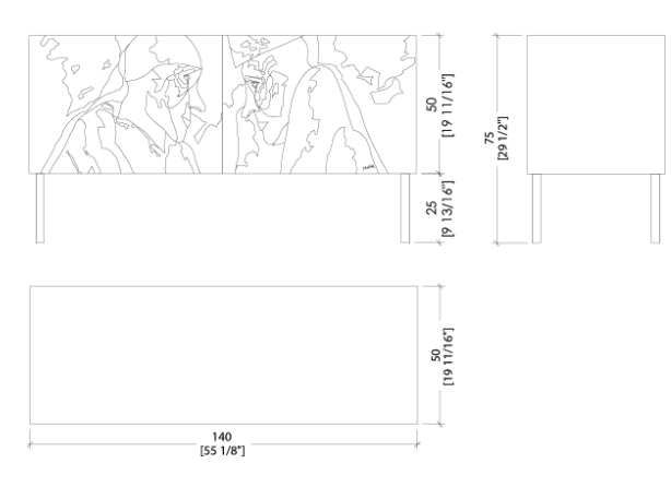 Комод с ножками из матового металла, инкрустированными дверцами и матовым лакированным шпоном из клена. Он также доступен в подвесном исполнении и оснащен выдвижными дверцами и одной внутренней полкой.