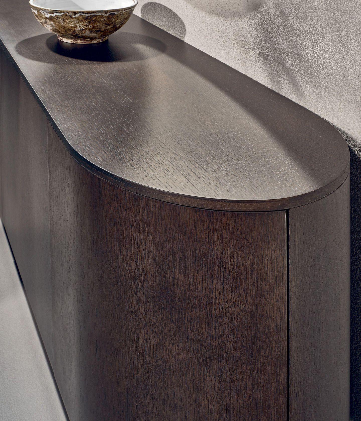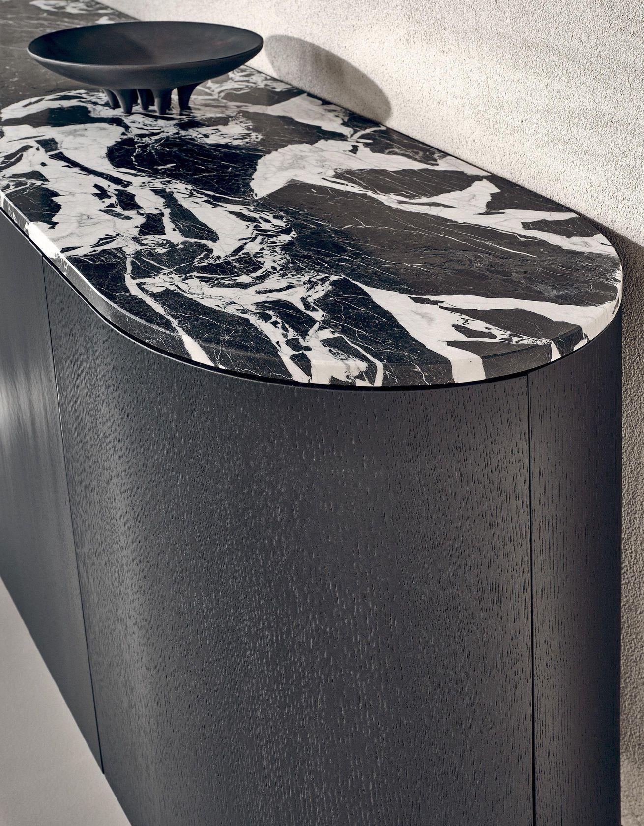 Главная особенность комода Flow — его деревянные основания, которые создают иллюзию движения, словно застывшая волна. В отличие от традиционных массивных комодов, этот предмет мебели визуально облегчает пространство, сохраняя при этом благородную монументальность. Стилистическое решение дополняется выбором материалов для столешницы: мрамор, натуральное дерево или керамика — каждый вариант привносит свою уникальную эстетику.