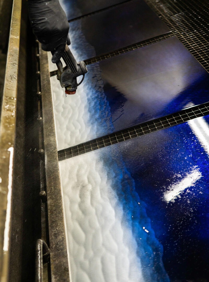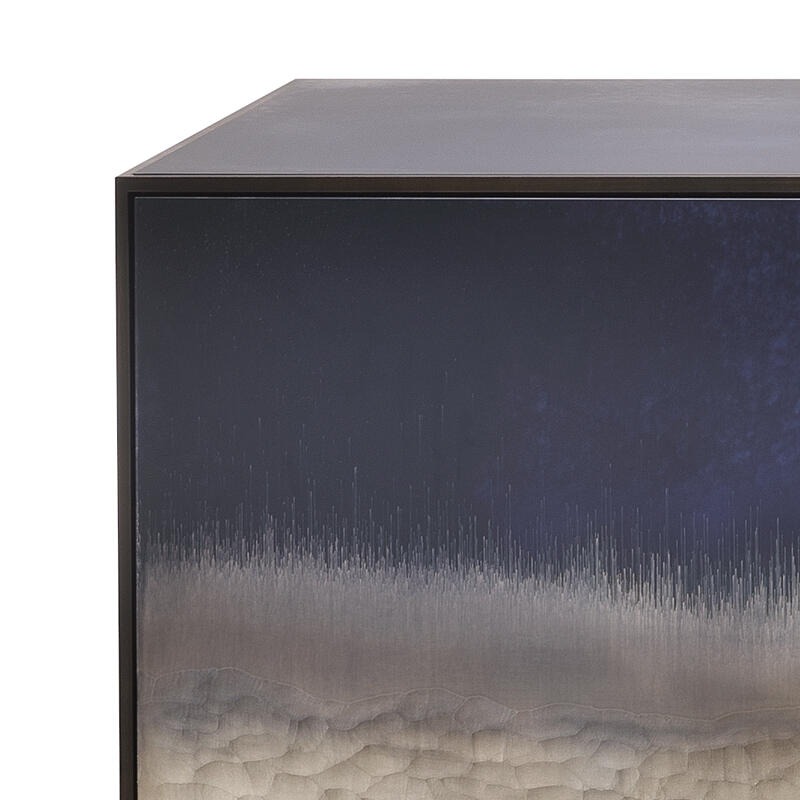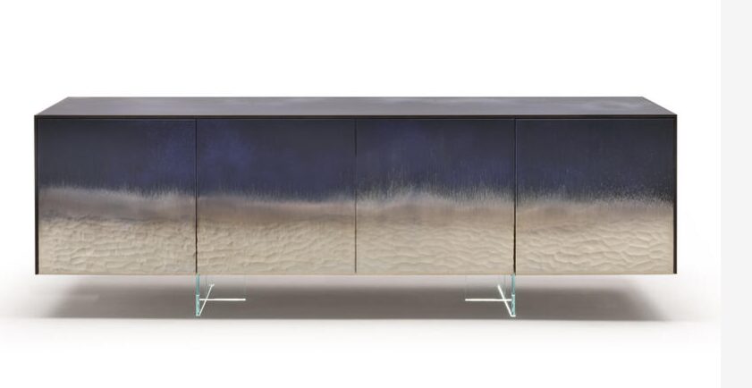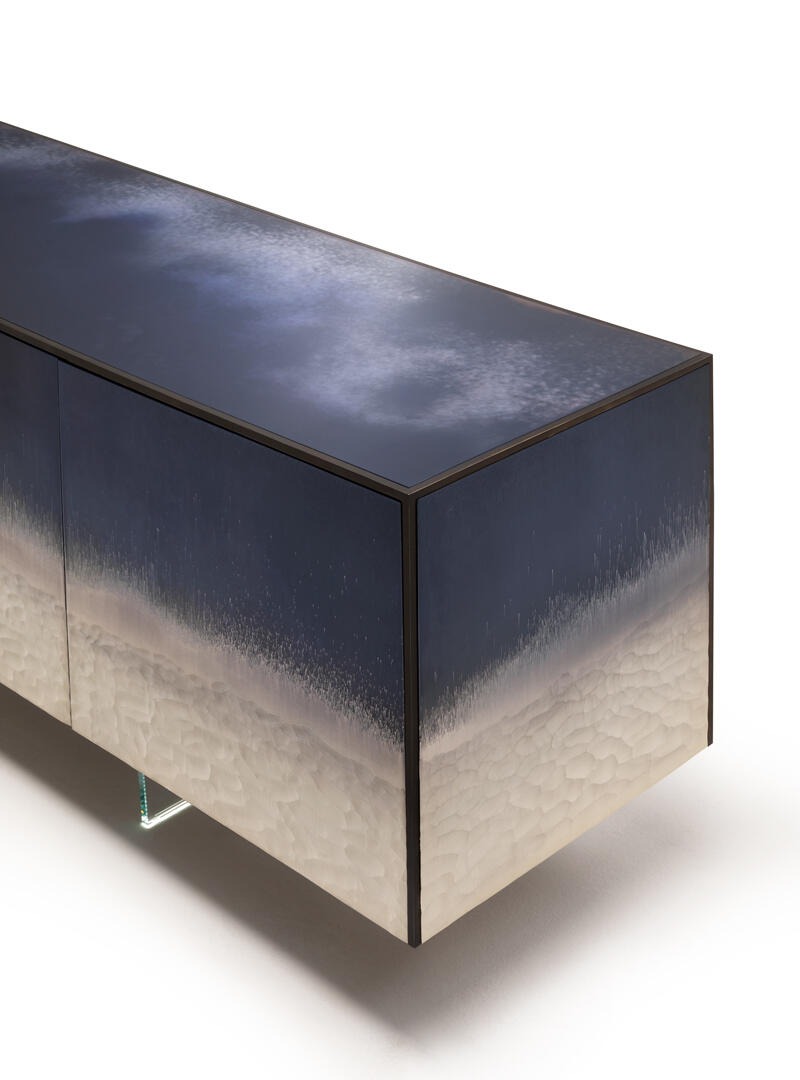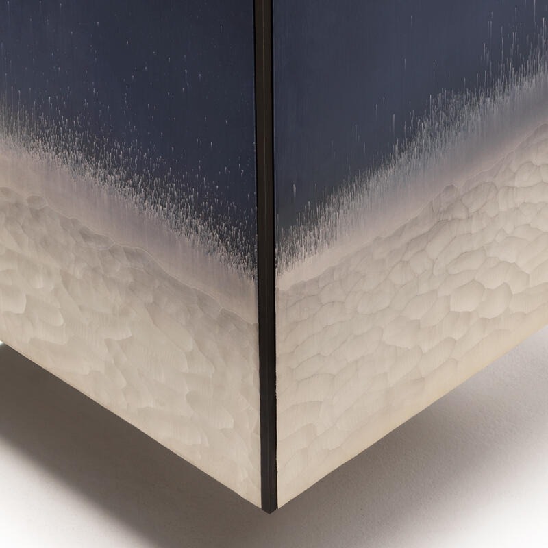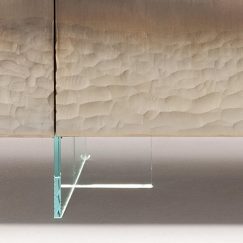 Конструкция из фанеры, шпонированной ясенем и покрытой титановым металлическим лаком. Массивный металлический профиль из темной полированной латуни.