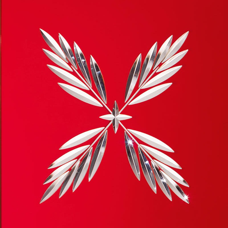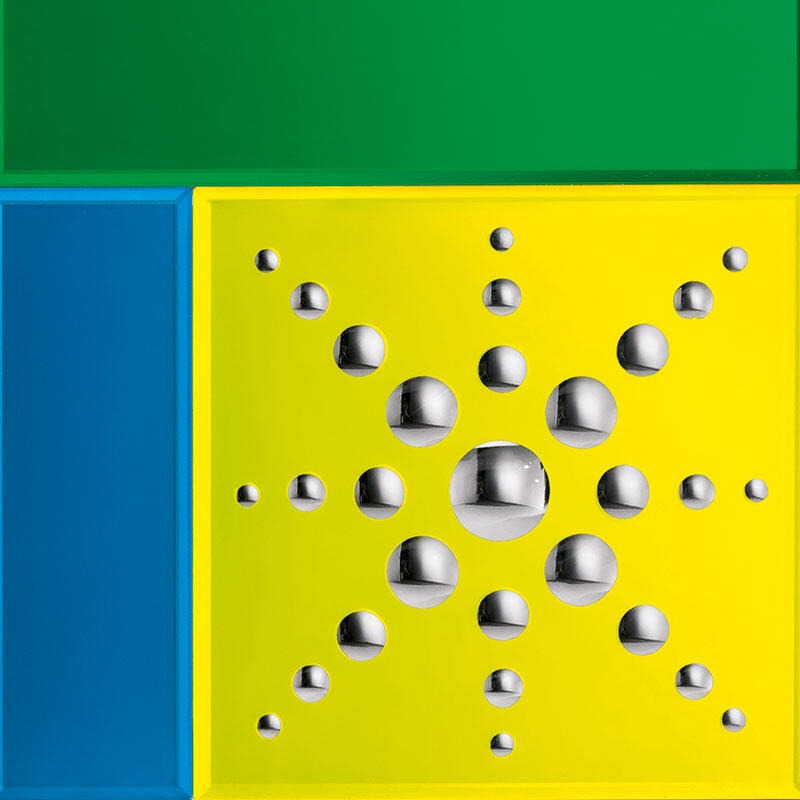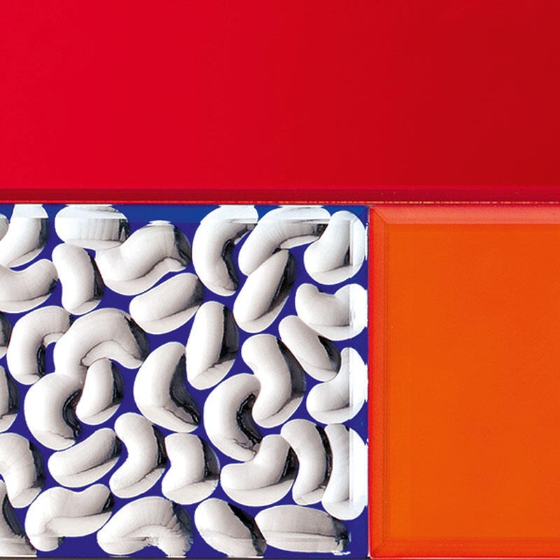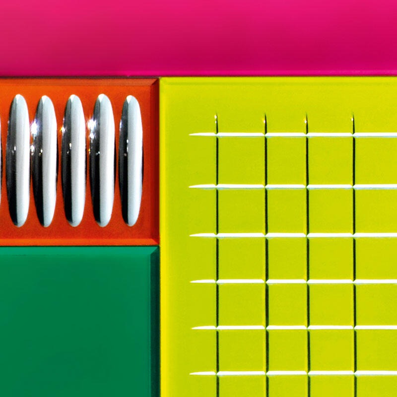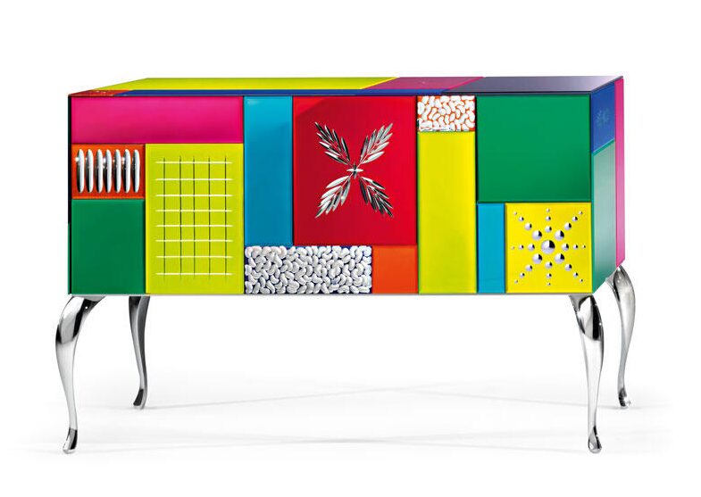 Конструкция из дерева, покрытая белым матовым лаком. Четыре фигурные ножки из литого стеклоалюминия с хромированным покрытием. Три дверцы и три выдвижных ящика с двухтактным открыванием.