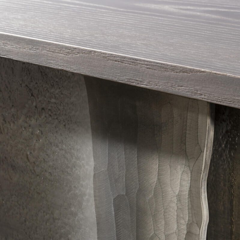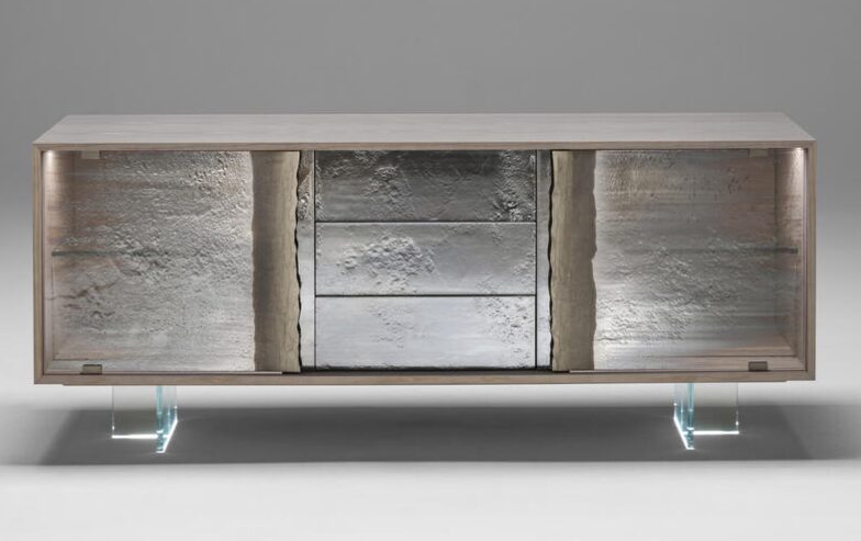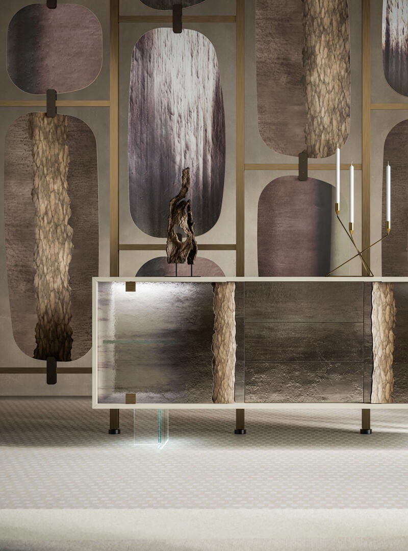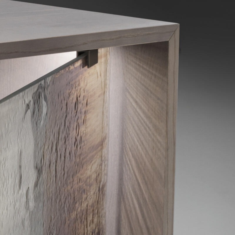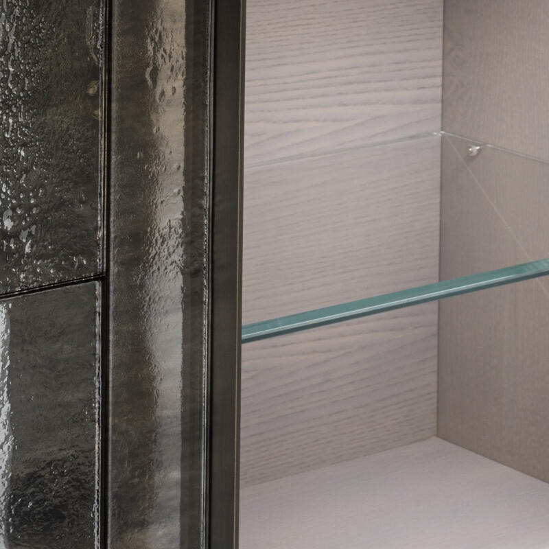 Конструкция из ясеня с отделкой Alba. Две двери из закаленного стекла толщиной 8 мм с отделкой Barbaresco и Roddi с металлическими петлями из матовой полированной латуни.