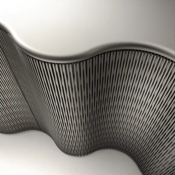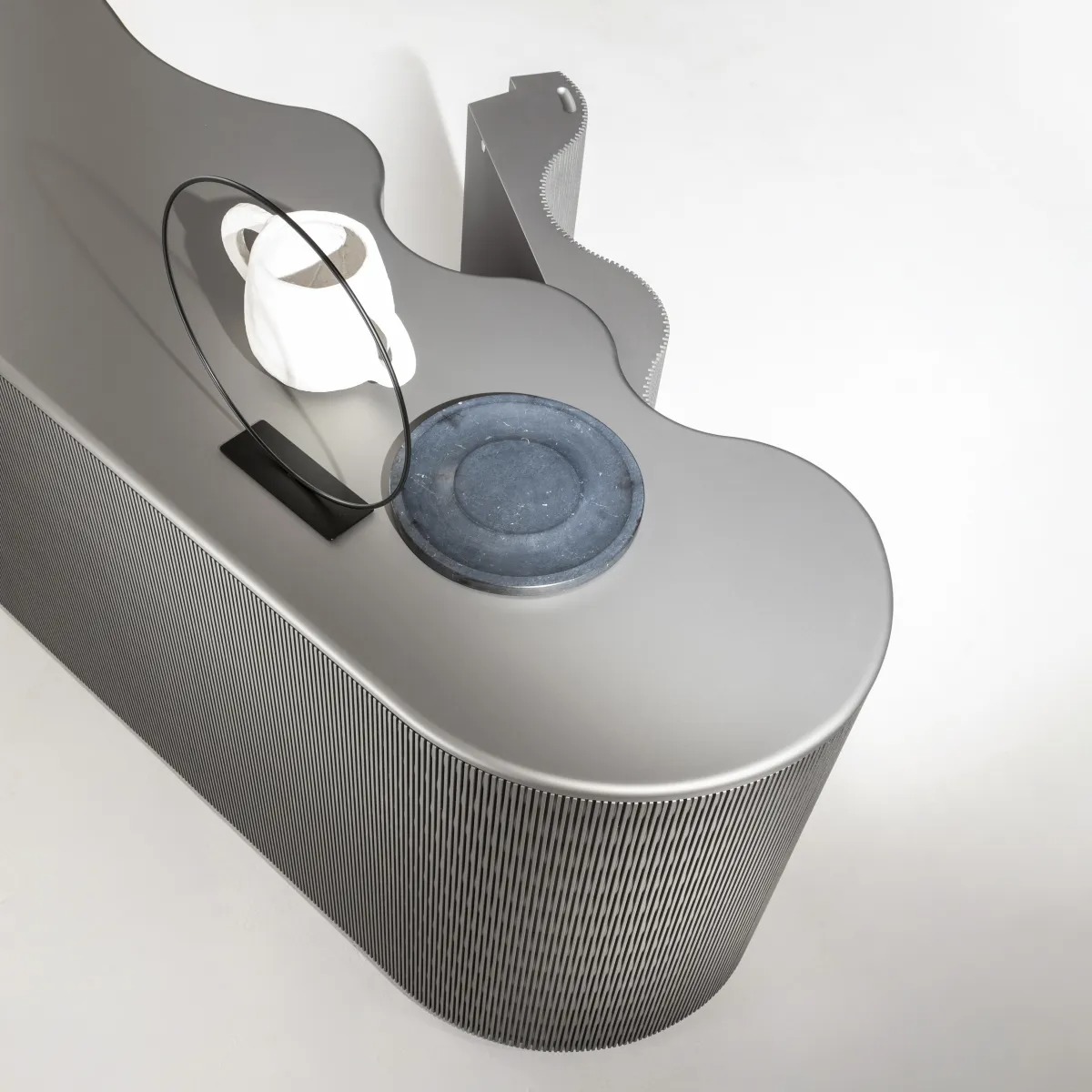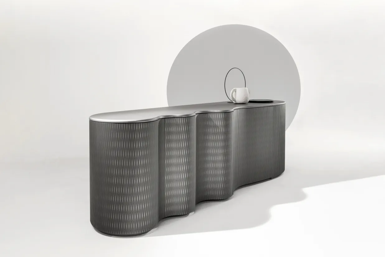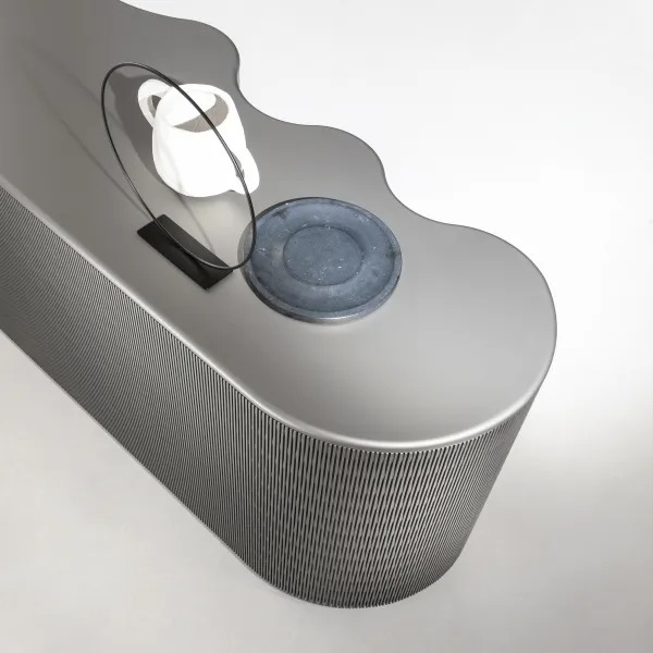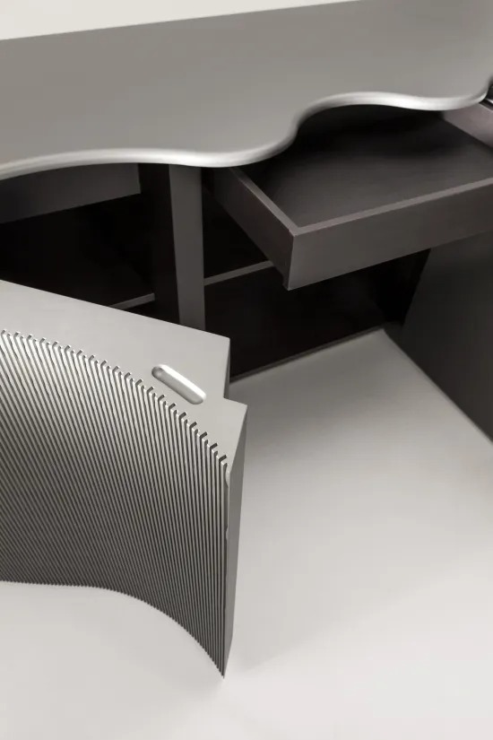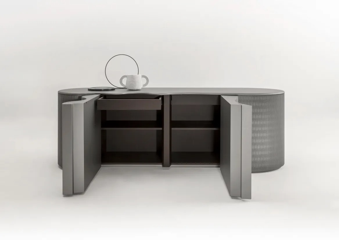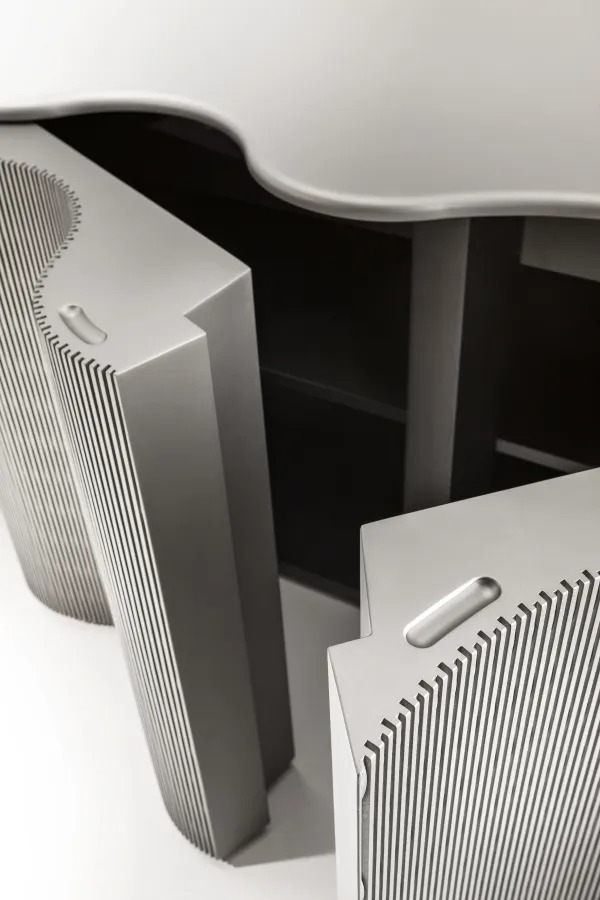 Комод из дерева с отделкой Лаком 61, с особым основанием и изогнутыми распашными дверцами с геометрическим сотовым рисунком. Оснащен двумя внутренними ящиками и полками.