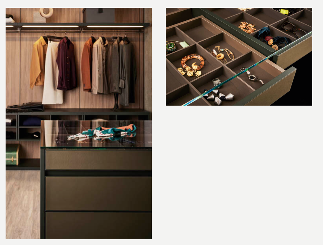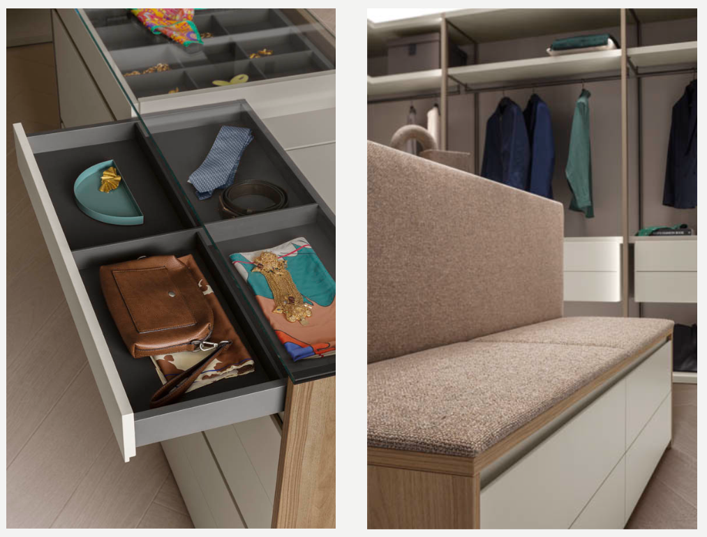 Уникальность и стиль. Отдельно стоящий модуль, который является идеальным дополнением к гардеробным Pianca, в которых, как и в самых эксклюзивных бутиках, хранятся роскошные аксессуары, ювелирные украшения и ценные вещи, хранящие воспоминания. Существует множество видов предметов и одежды, которые можно хранить внутри, а также множество предлагаемых аксессуаров, включая выдвижные ящики, стеклянные витрины, полки, лотки для хранения и подставки для обуви. Версия скамейки практична и декоративна одновременно, обеспечивая удобное и в то же время элегантное решение для наслаждения моментами расслабления, погружения в теплую и изысканную атмосферу.