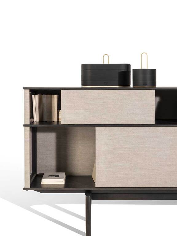 Вдохновленный миром hi-fi динамиков, самонесущий книжный шкаф Lloyd Tex, разработанный Жаном-Мари Массо, использует прозрачность и легкость панелей Techno-fabric, полупрозрачной технической ткани светлых и темных тонов. Панели скользят по невидимым горизонтальным направляющим, создавая постоянно меняющуюся последовательность.