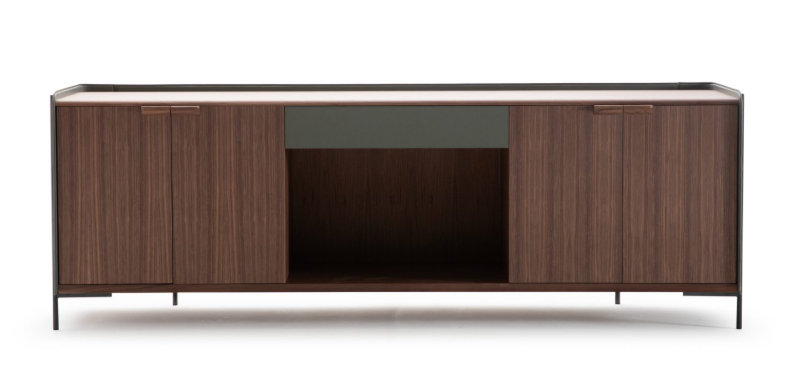 различных вариантах отделки. Дверцы, облицованные шпоном американского ореха, с ручками из массива американского ореха. Внутренний выдвижной ящик обтянут кожей. Внутри боковых отделений шкаф оснащен 2 внутренними выдвижными ящиками с полным выдвижением.