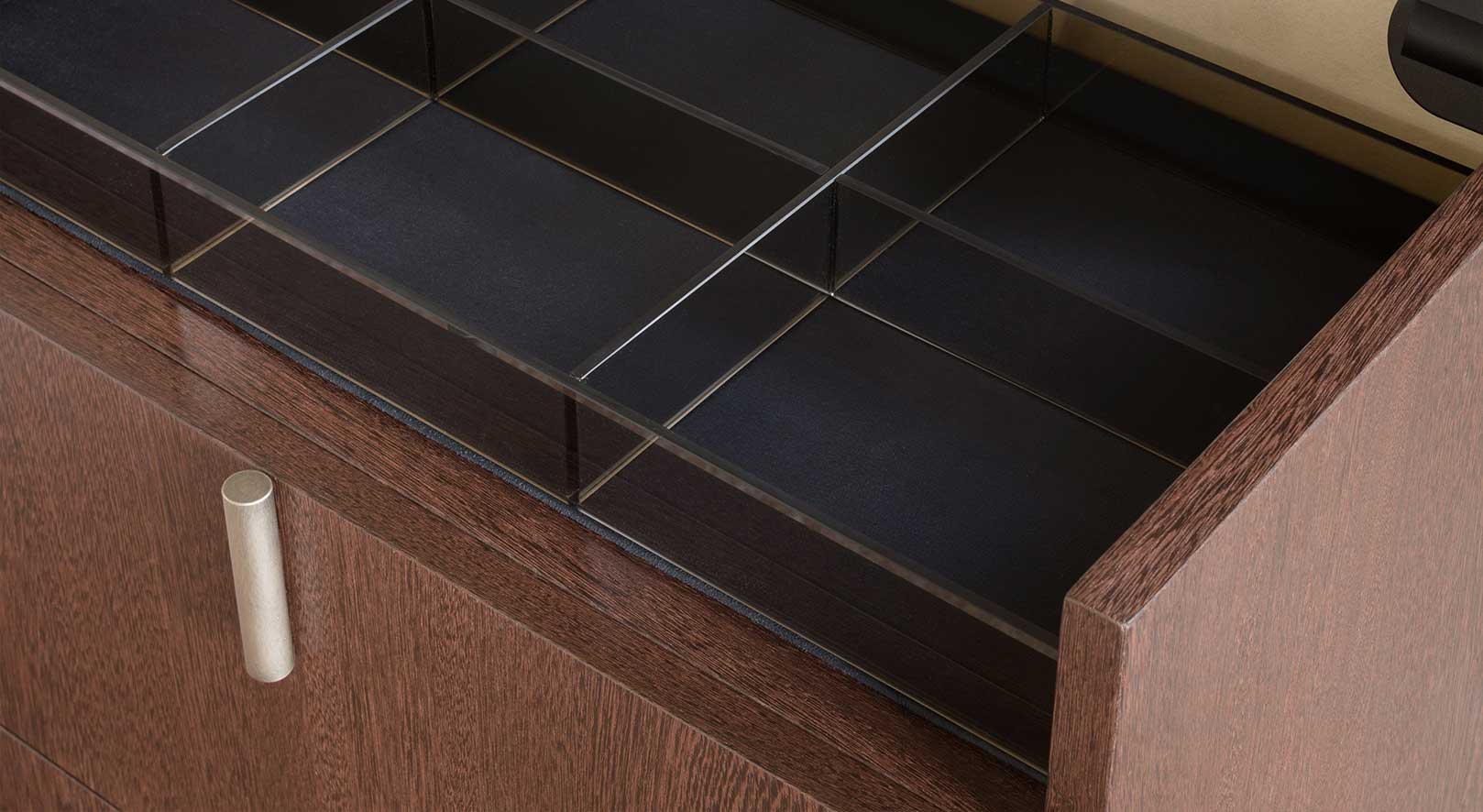 Минималистичные, с элегантными пропорциями, модели Magic являются выражением дизайнерского подхода, при котором особое внимание уделяется изделию, технологии его изготовления и материалам. Изделие отличается тонкими металлическими боковинами, покрытыми лаком, фасадом с откидной дверцей, зеркалом и механизмом мягкого закрывания. Внутренние части, покрытые эко-набуком, представляют собой разделительные элементы из дымчатого стекла. Функциональное пространство, позволяющее организовать все необходимое для выражения индивидуальности и уникальных черт.
