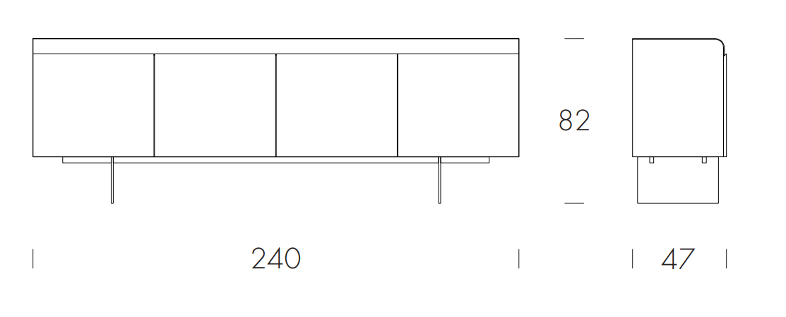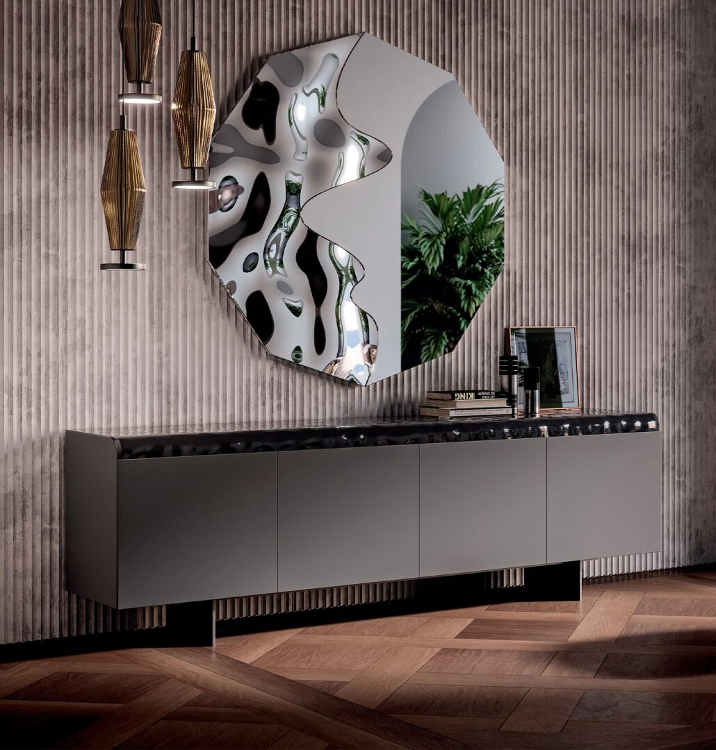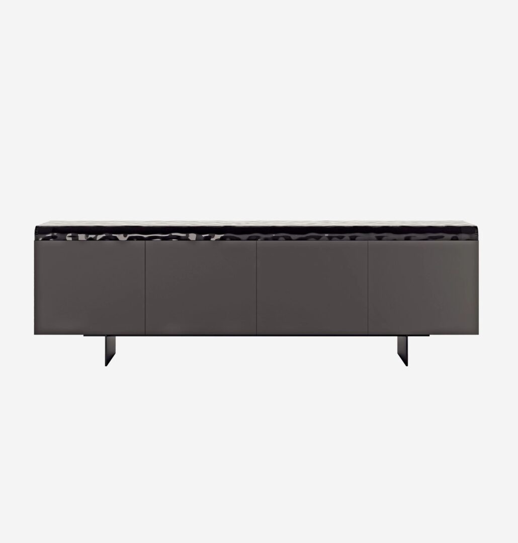 Шкаф для хранения с четырьмя дверцами, покрытыми бронзовой пленкой, с технологией постформования и изогнутым верхом из моноласты из черного кованого стекла, с металлическими ножками из бронзы. Магма вызывает эффект, создаваемый текучей текстурой кованого стекла, которое, сливаясь с деревом створок, придает мадии сценический эффект, который усиливает любую обстановку, делая ее ценной.
