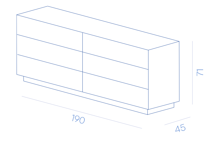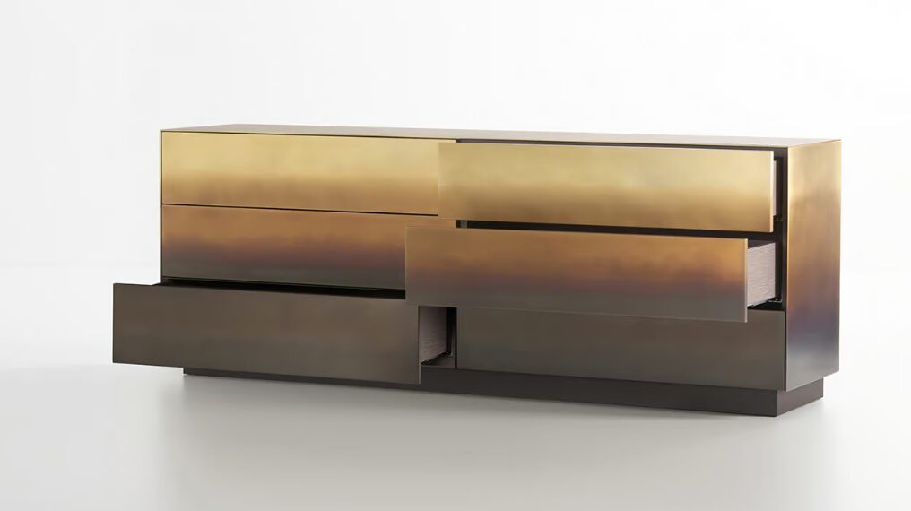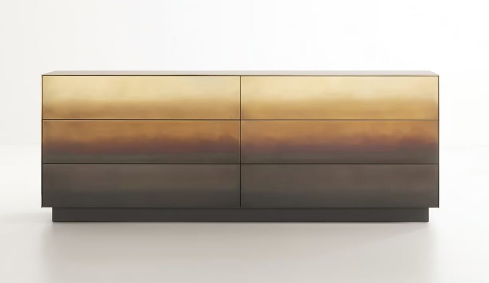 Комод Marea выдвигается горизонтально, с тремя-шестью широкими выдвижными ящиками, выполненными из дерева, которые отличаются от верхней части, отделанной металлом. Являясь чем-то средним между объектом дизайна и произведением искусства, Marea является уникальным предметом мебели благодаря отделке, выполненной исключительно вручную, которая превращает металлическую поверхность в нежную акварель.