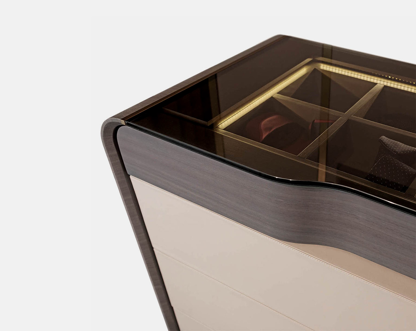 Коллекция Melting Light вдохновлена игрой света и тени, что отражается в плавных, словно «тающих» линиях комода. Три выдвижных ящика, скрытые под волнообразным кожаным узором в шахматном порядке, создают эффект динамики и легкости. Ручки утоплены в фактуру, подчеркивая минималистичную элегантность. Дополняет образ столешница из бронзированного стекла, придающая мебели современный и одновременно классический шарм.