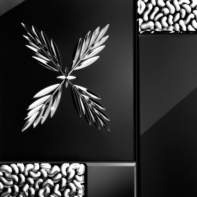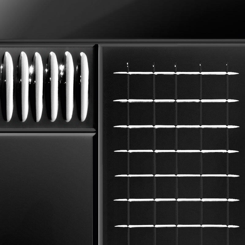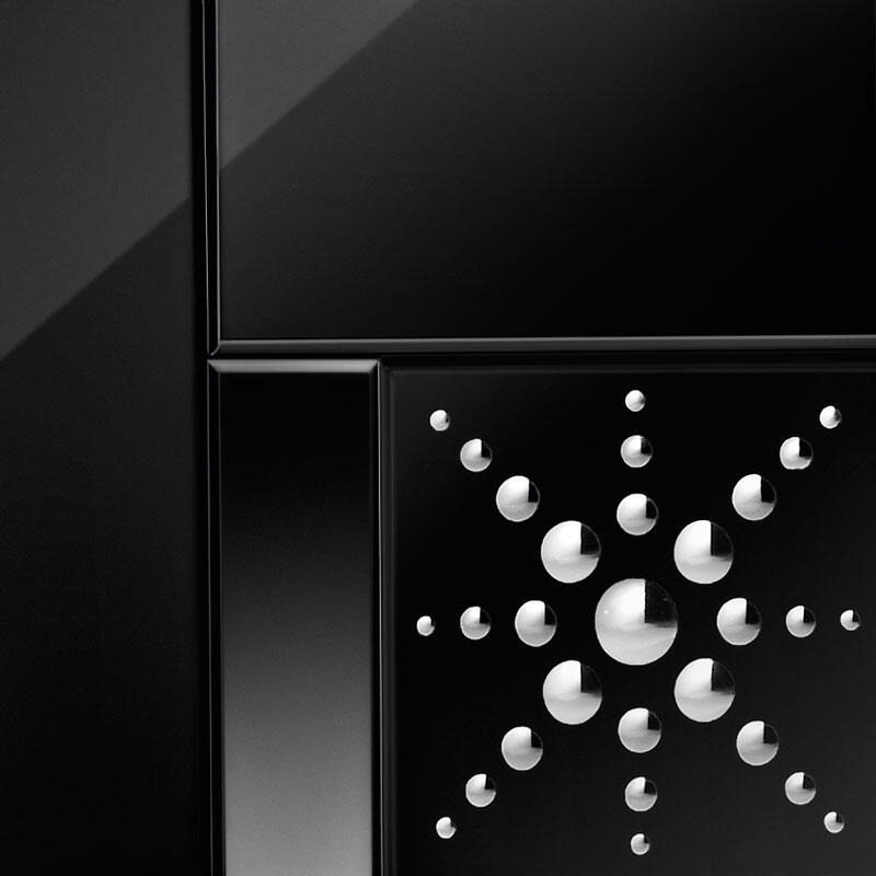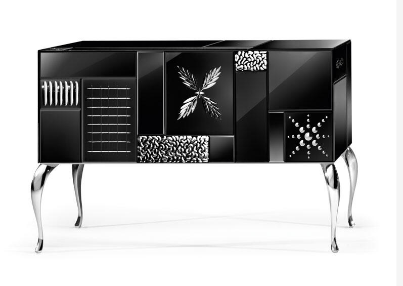 Конструкция из дерева, покрытая белым матовым лаком. Четыре фигурные ножки из литого стеклоалюминия с хромированным покрытием. Три дверцы и три выдвижных ящика с двухтактным открыванием.