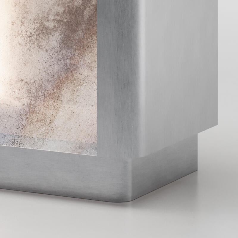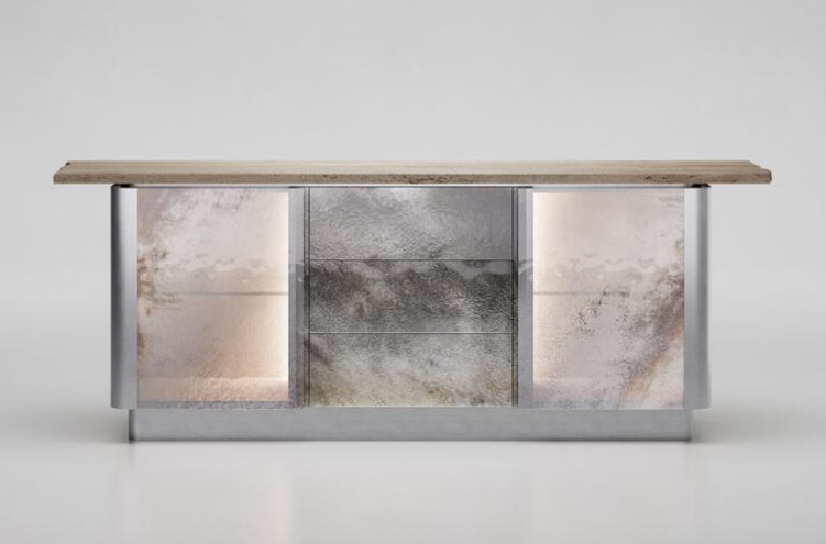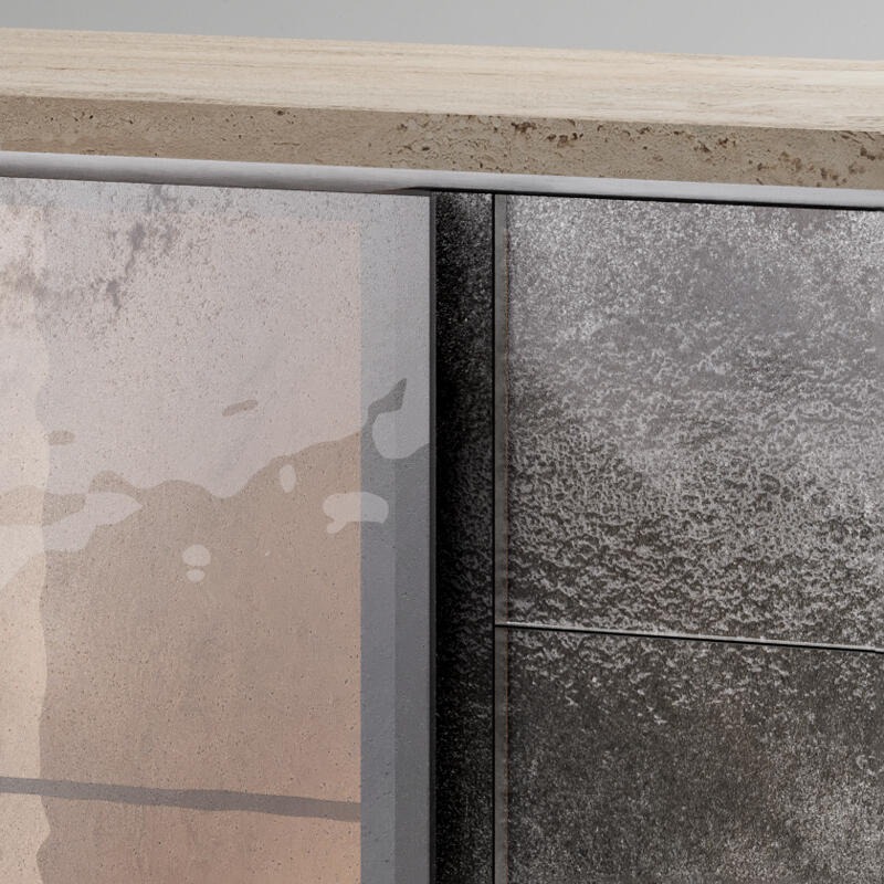 Деревянная конструкция с отделкой из сланцевого дуба. Два выдвижных ящика с выдвижным механизмом, левый из дерева и правый с декорированной стеклянной передней частью в отделке Roddi, металлическая кромка из матовой полированной латуни.
