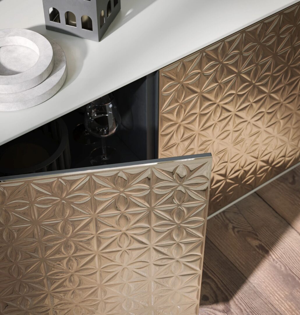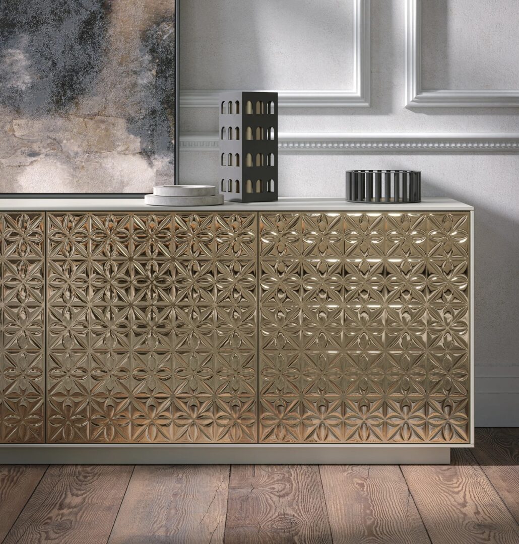 Благодаря сочетанию лакированного дерева и стекла, madia Off придает окружающей среде яркость и элегантность; ретро посеребренное расплавленное стекло создает игру света и бликов, которые повышают ценность материала и обработки.
