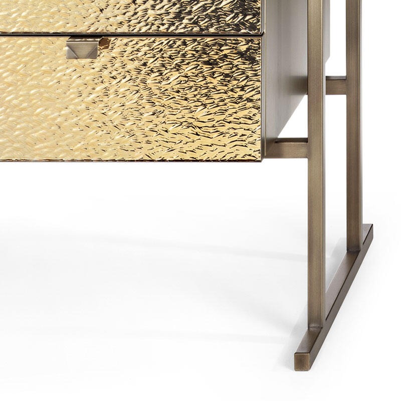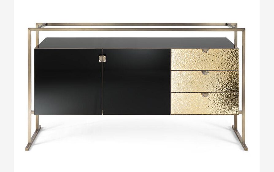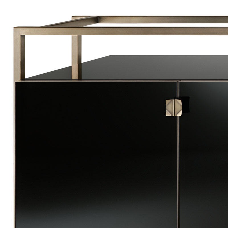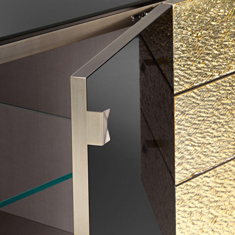 Металлическая рама в форме трубы с отделкой из античной латуни. Конструкция выполнена из серого дерева с матовой отделкой. Две дверцы и три выдвижных ящика с системой плавного закрывания.