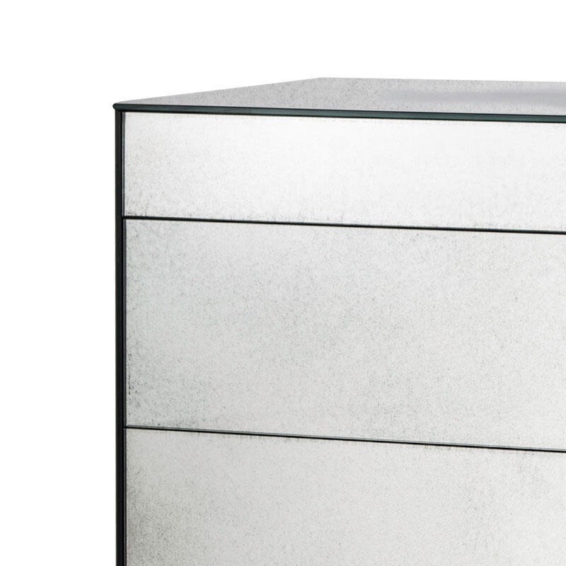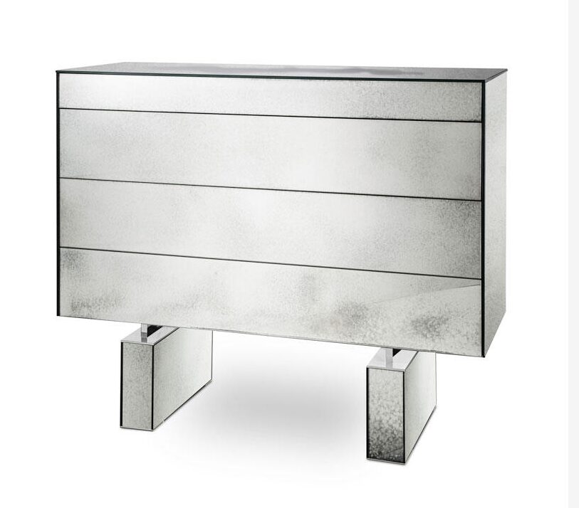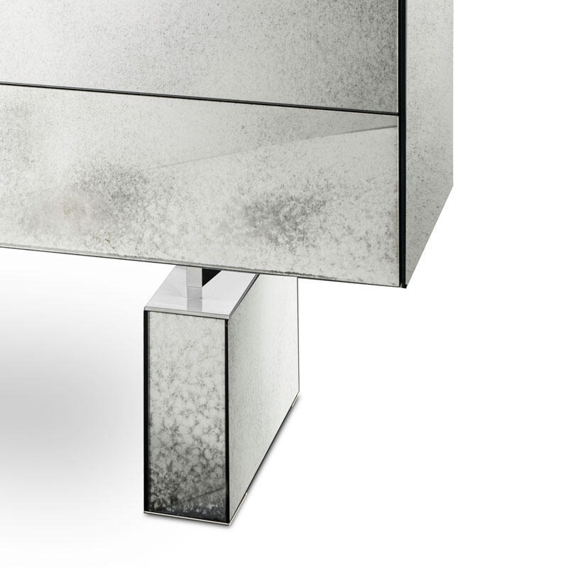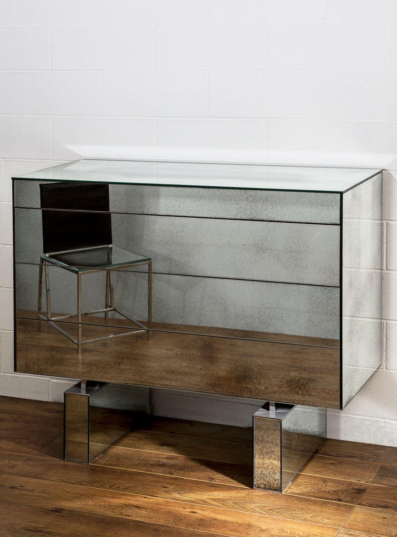 Стеклянный комод, частично отделанный старинным зеркалом, в стиле “Лагуна”. Конструкция из блестящей нержавеющей стали и шпонированного дерева, окрашенного в цвет дуба.