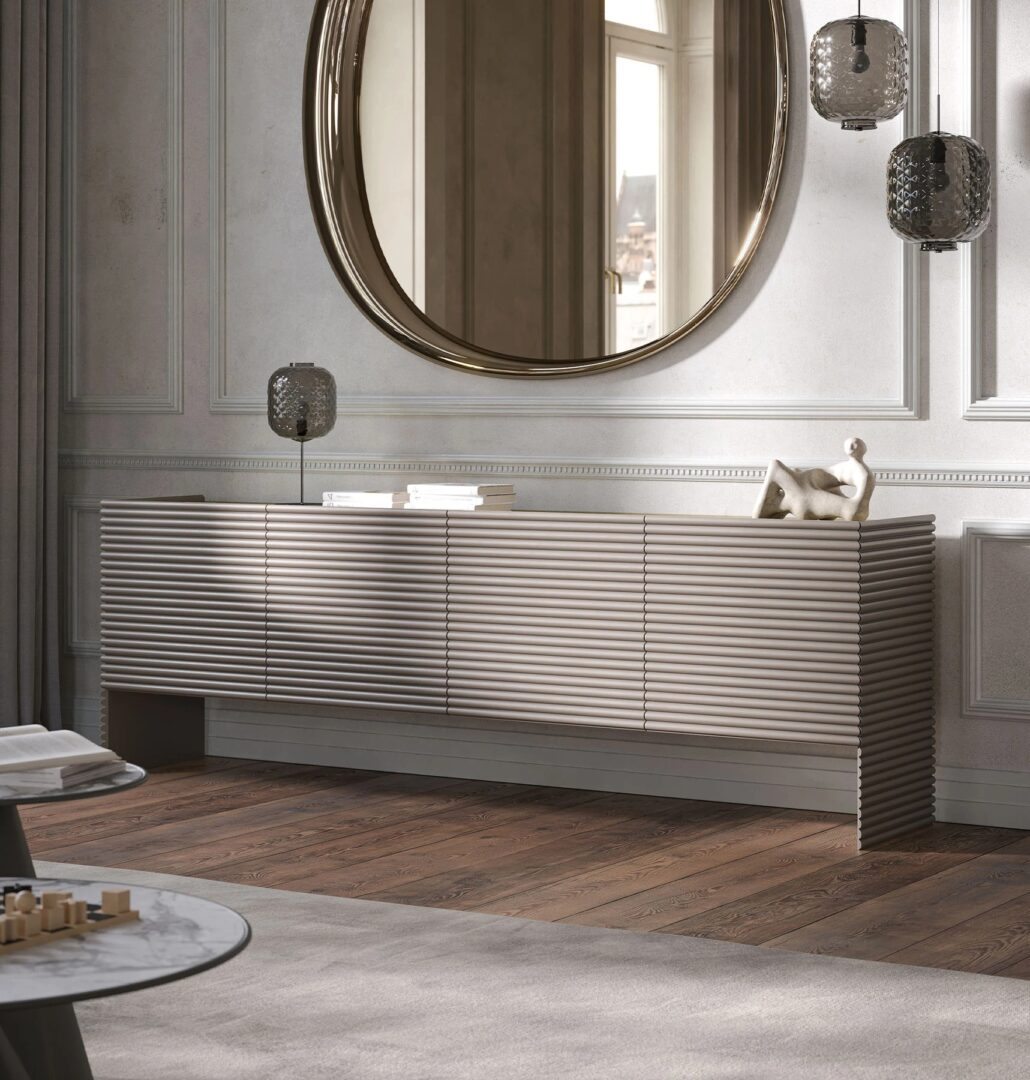 Patsy-это элегантный шкаф из лакированного дерева, характеризующийся горизонтальным фрезерованием, которое повторяется по бокам и дверям. Верх также доступен в бронзовом зеркале.
