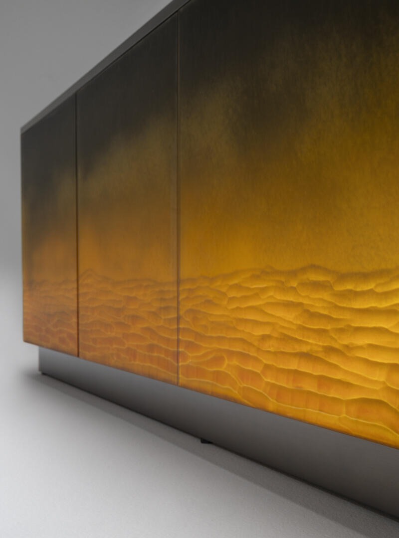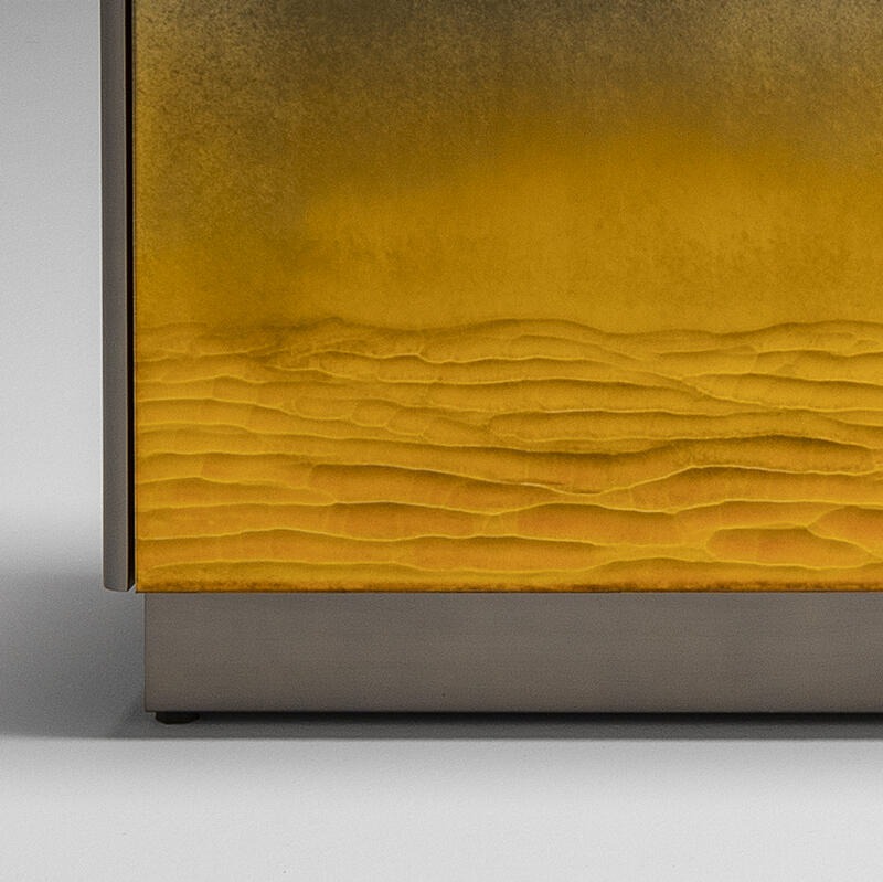 Сервант в отделке Gargano из травленого стекла. Плинтус и внешние кромки из дерева, покрытого лаком с отделкой из полированной латуни, внутренняя отделка из матового дуба.