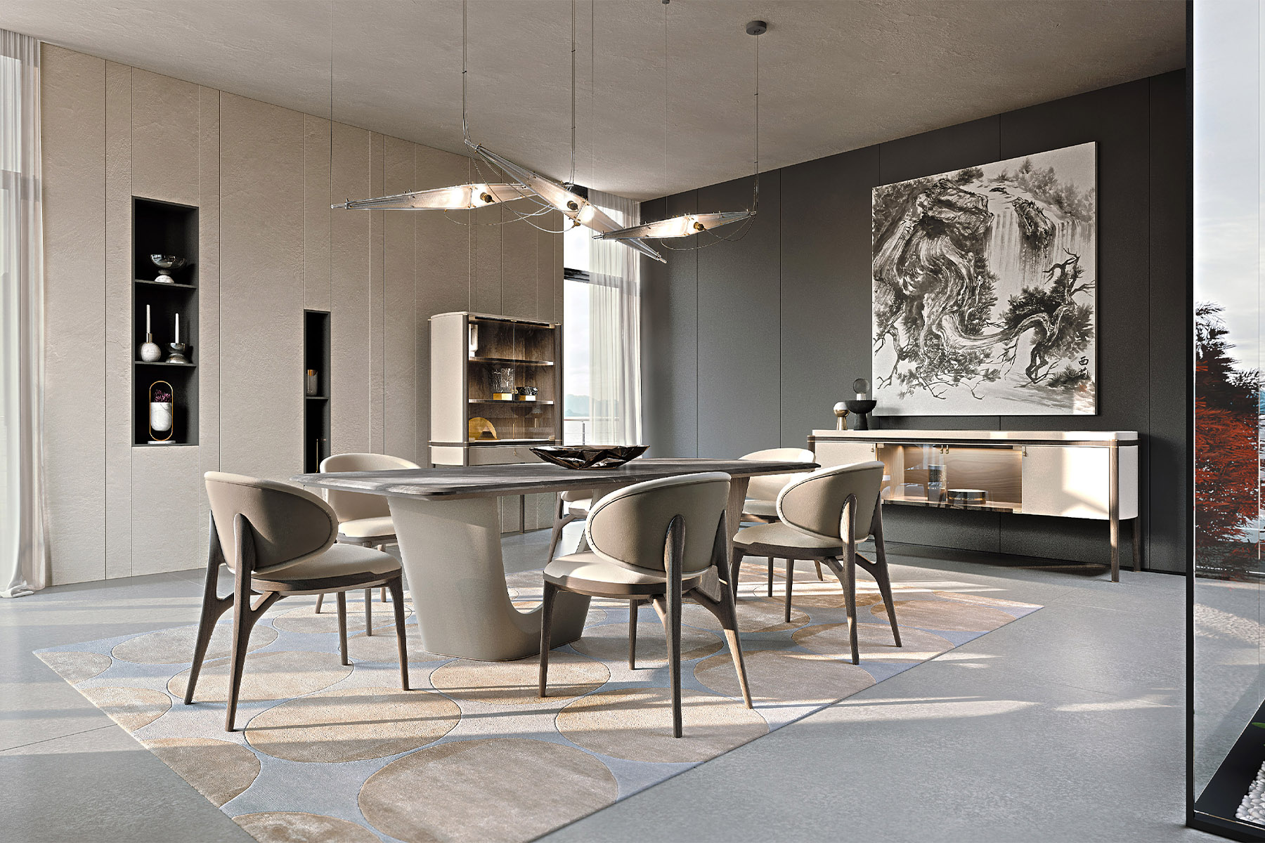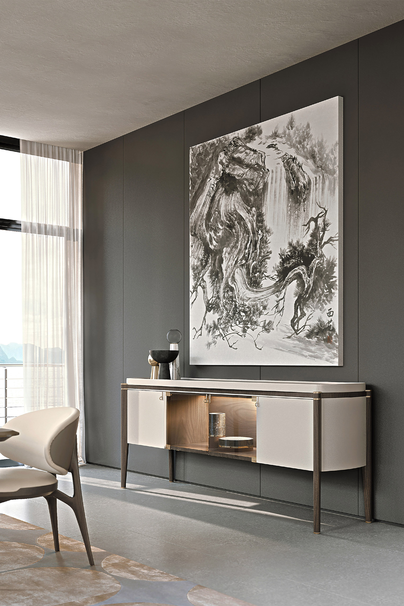 Комод Pinnacle отличается изысканной игрой форм: мягкие изогнутые стенки эффектно контрастируют с прямыми ножками, создавая динамичный и в то же время утонченный силуэт. Такой дизайн подчеркивает авторский почерк TURRI, где каждая деталь продумана до мелочей. Столешница, выполненная из натурального мрамора или ценных пород дерева, добавляет роскошный акцент, а светодиодная подсветка мягко выделяет внутреннее пространство, придавая интерьеру теплый и благородный свет.