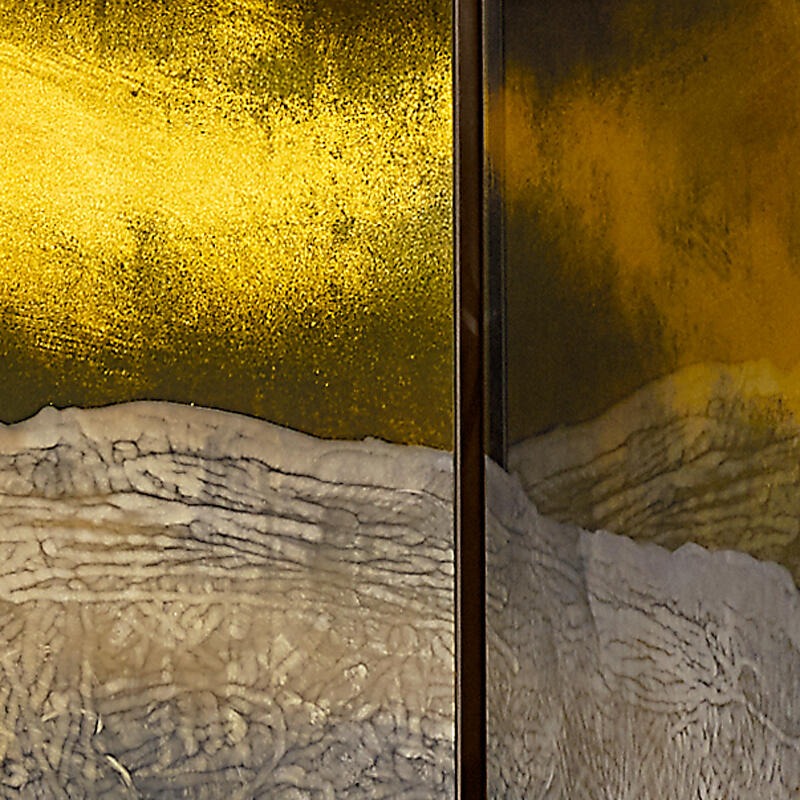 Покрытая лаком и матовым шпоном фанера из ясеня. Четыре двери из особо прозрачного стекла, украшенные гравюрами и золотой краской, посеребрены под старину.