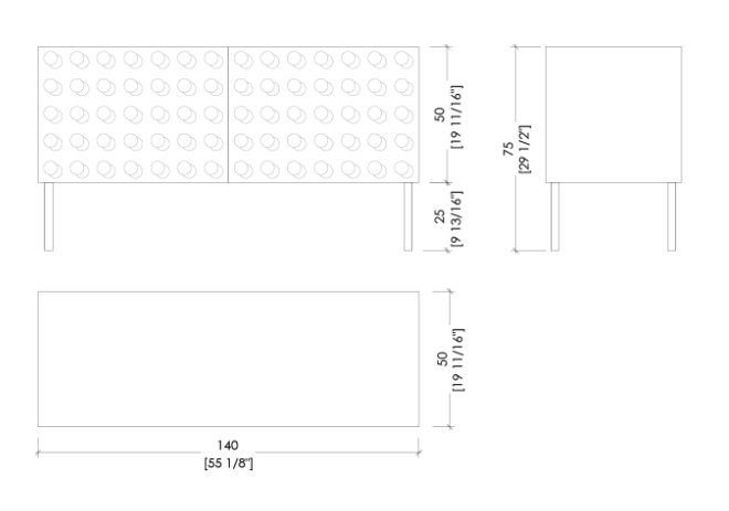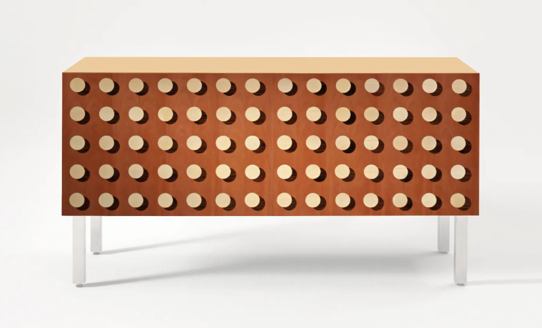 Комод с ножками из брашированного металла, c дверцами с инкрустацией и шпонированным кленом корпусом. Дверцы с открыванием нажанием push-pull, наличие внутренней полки. Доступна также в настенном варианте.