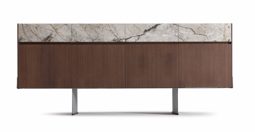 Внутренняя поверхность выполнена из шпона американского ореха или в других вариантах отделки. Металлическая конструкция, обтянутая кожей по бокам и под шкафом. Выдвижные ящики и столешницы отделаны мрамором с непрерывной зернистостью под углом 45°. Металлические ножки, обтянутые кожей, с заземляющей клеммой , доступны в различных вариантах отделки.