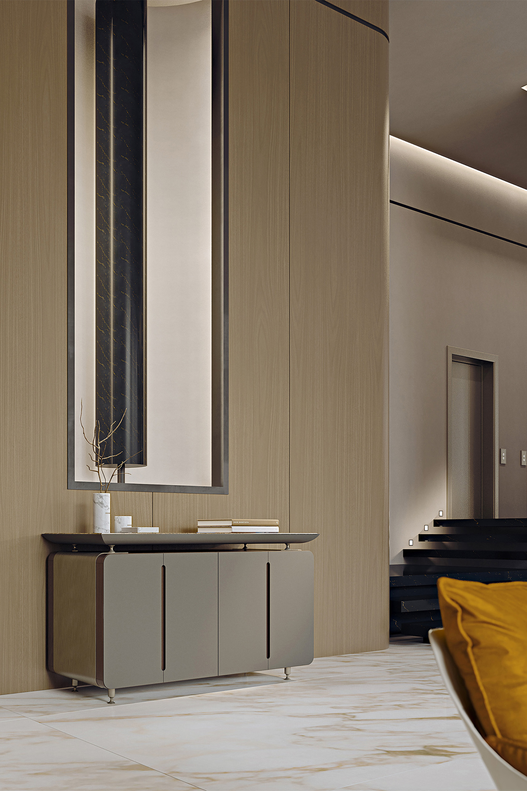 Комод Silhouette отличается строгими, но выразительными линиями, которые подчеркивают его эстетическую гармонию. Четыре дверцы, обтянутые эвкалиптовой кожей с термическим напылением, создают эффект благородной текстуры, а металлические ножки придают конструкции воздушность и легкость. Верхняя часть комода покрыта высококачественным лаком, а полка отделана натуральным мрамором — этот контраст материалов делает его по-настоящему уникальным.