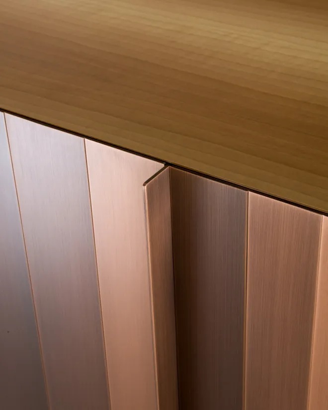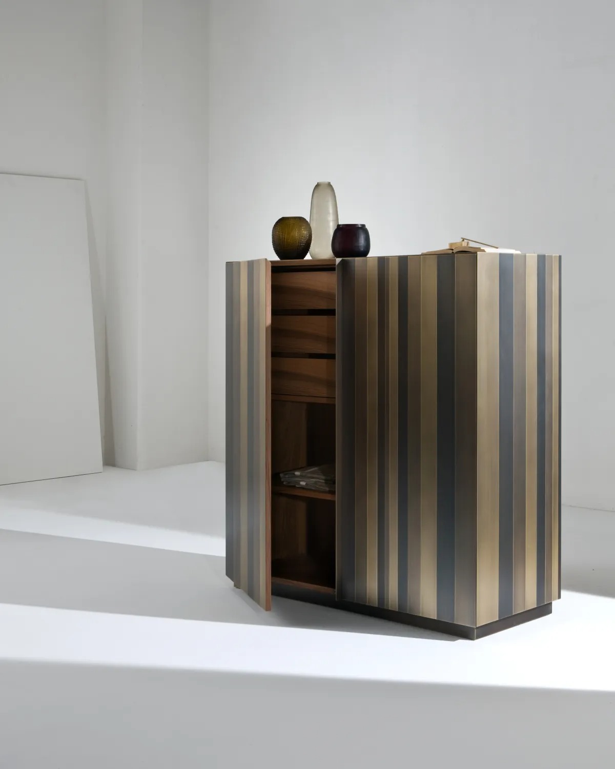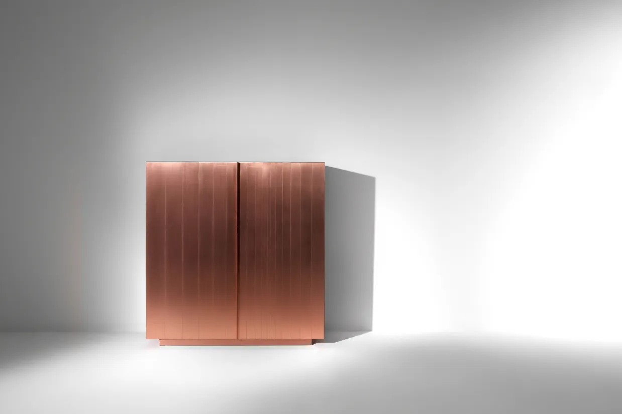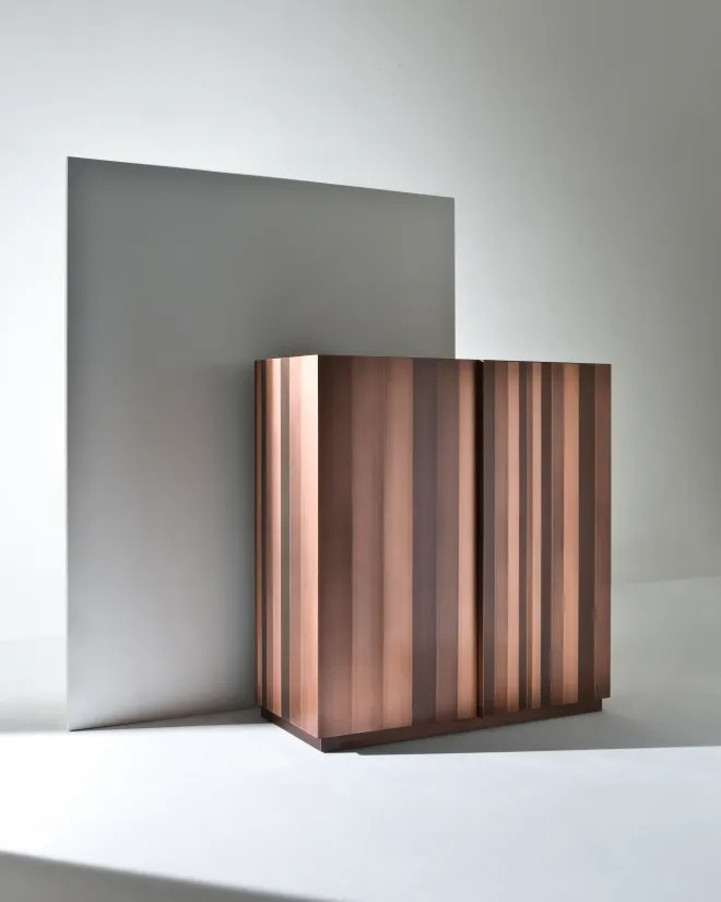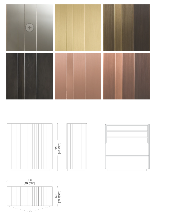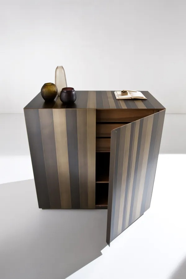 Высокий комод с двумя распашными дверцами оснащен 3-мя внутренними ящиками и полкой. Боковины, дверцы и основание покрыты металлом, а внутренние стороны шпонированы орехом «Colore».