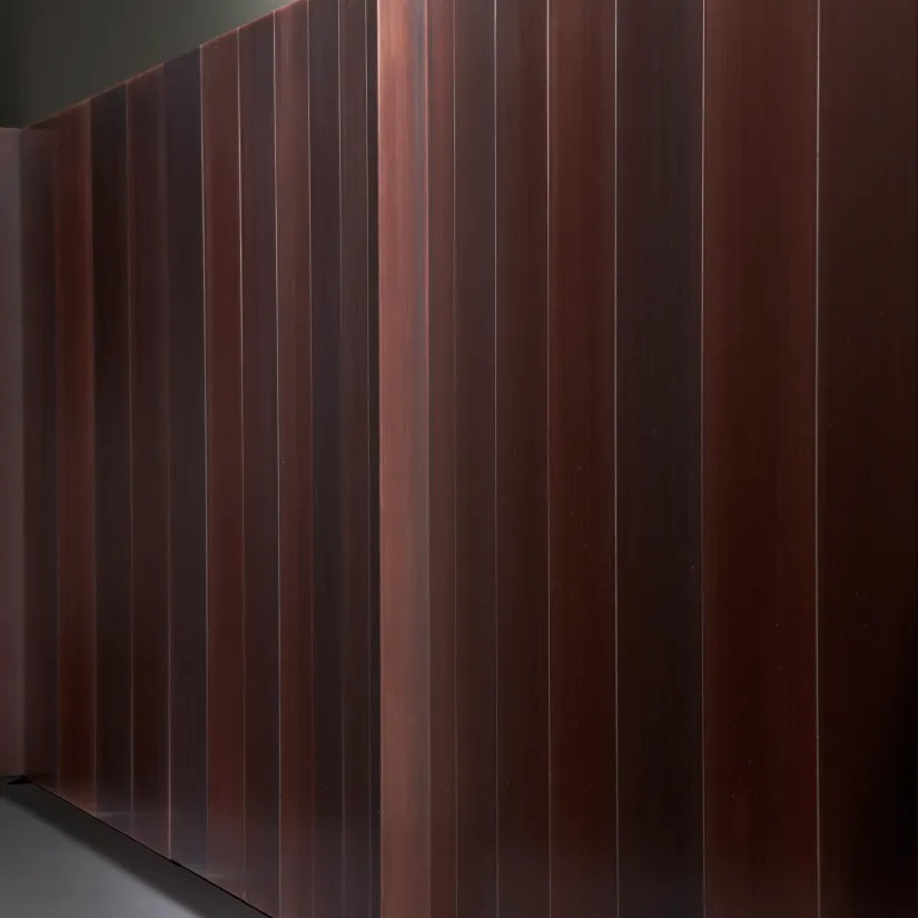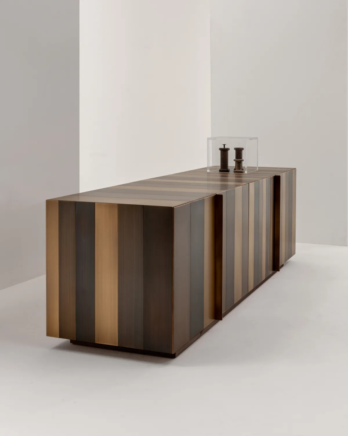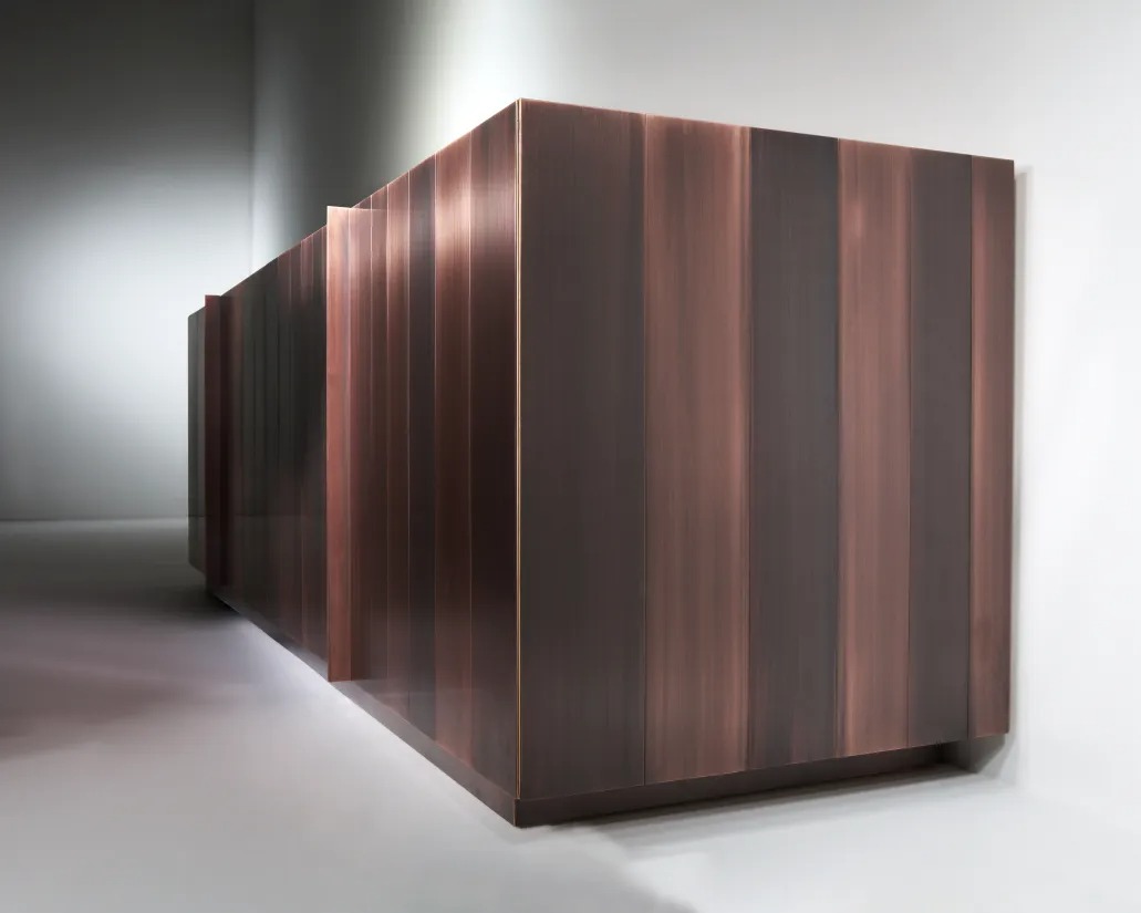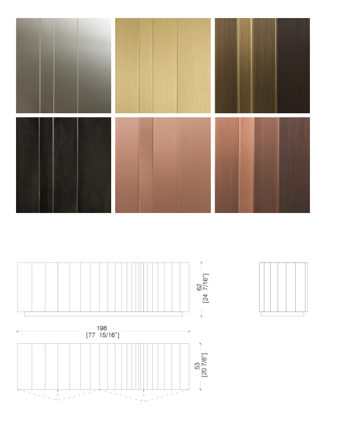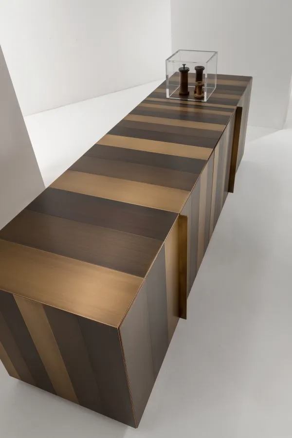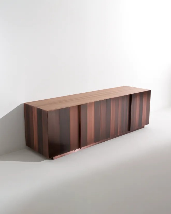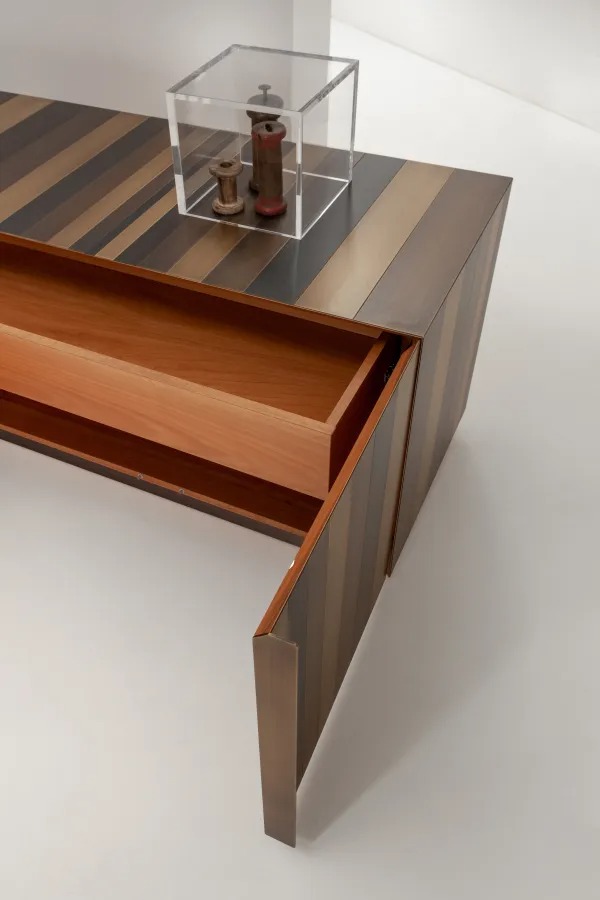 Низкий комод с 4-мя распашными дверцами и основанием из металла, оснащенный двумя внутренними ящиками. Боковины, дверцы и основание облицованы металлом.
