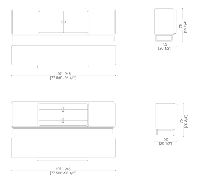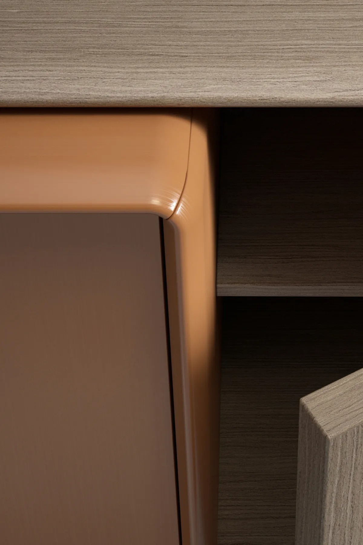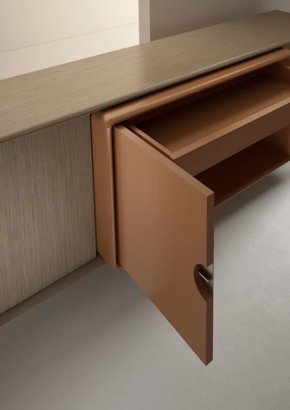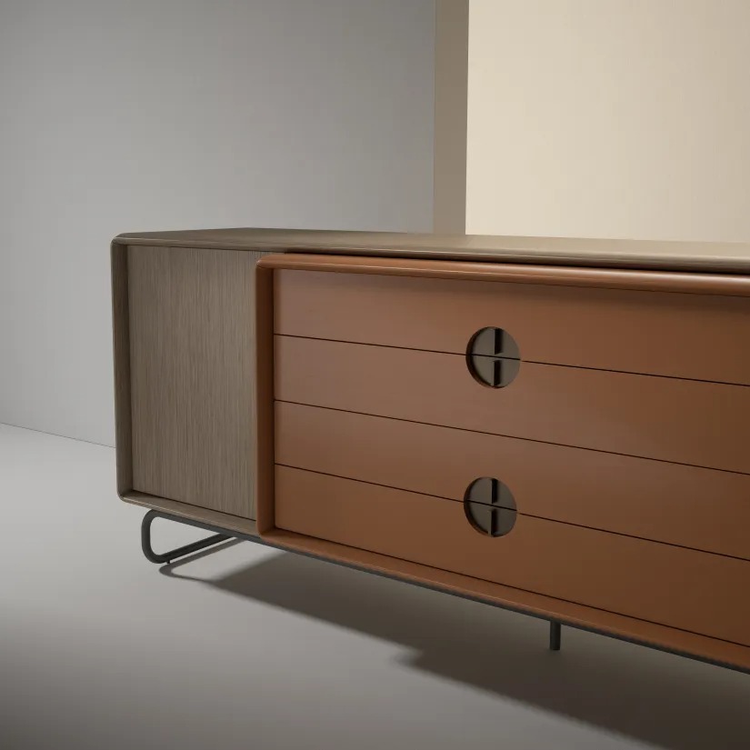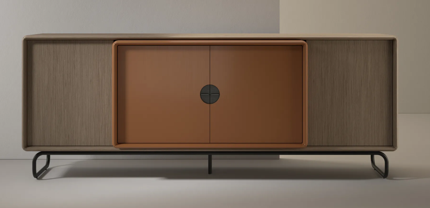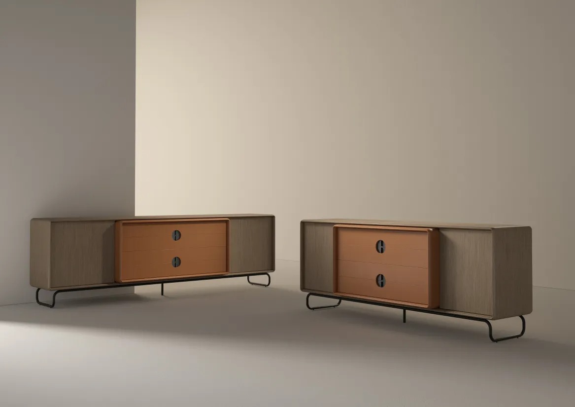 Комод с открытыми отсеками, распашными дверцами или деревянными ящиками, трубчатыми металлическими ножками и дизайнерской ручкой из темного латуни.