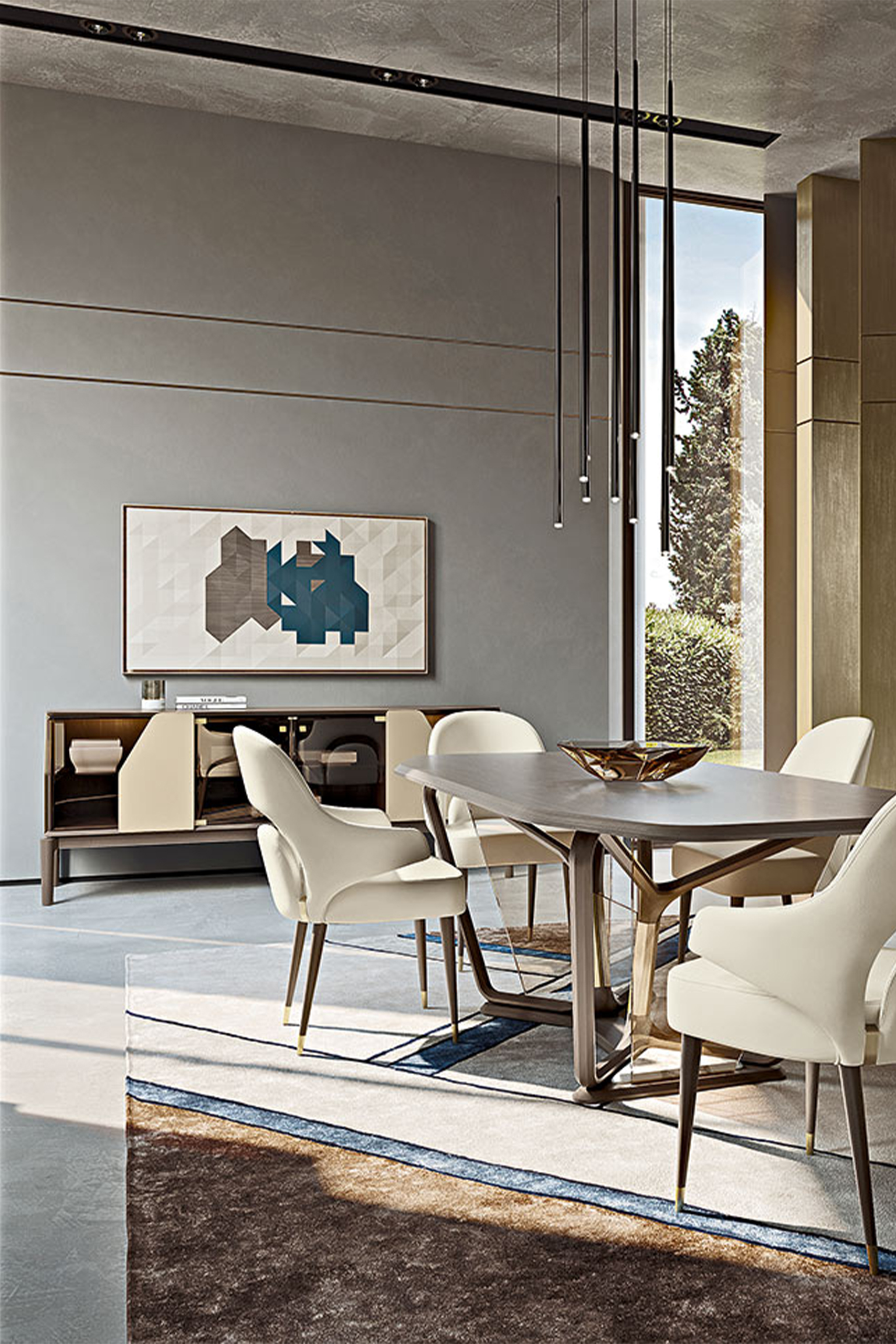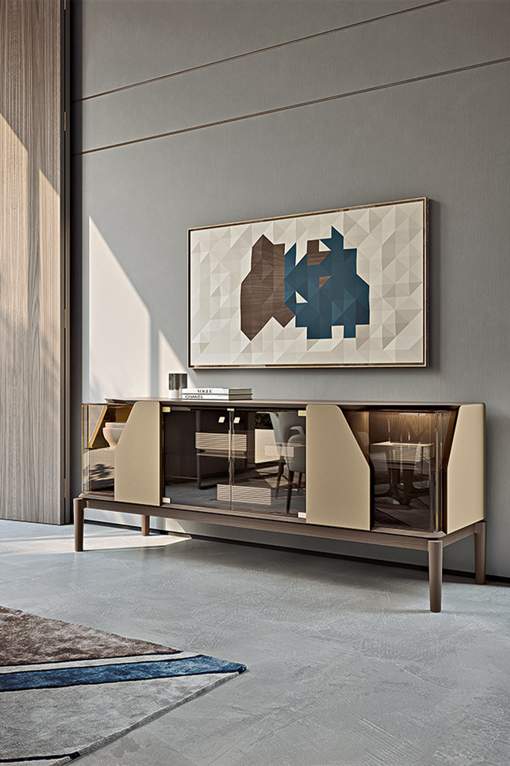 Комод Vine — это игра объемов и текстур, где дерево, стекло и кожа сливаются в единый художественный ансамбль. Архитектурные линии создают динамичный ритм, а продуманные пустоты добавляют легкости массивной конструкции. Встроенное светодиодное освещение мягко подсвечивает внутреннее пространство, превращая комод в изысканный арт-объект. Такой предмет мебели идеально впишется в гостиную или спальню, добавляя интерьеру нотку современной классики.