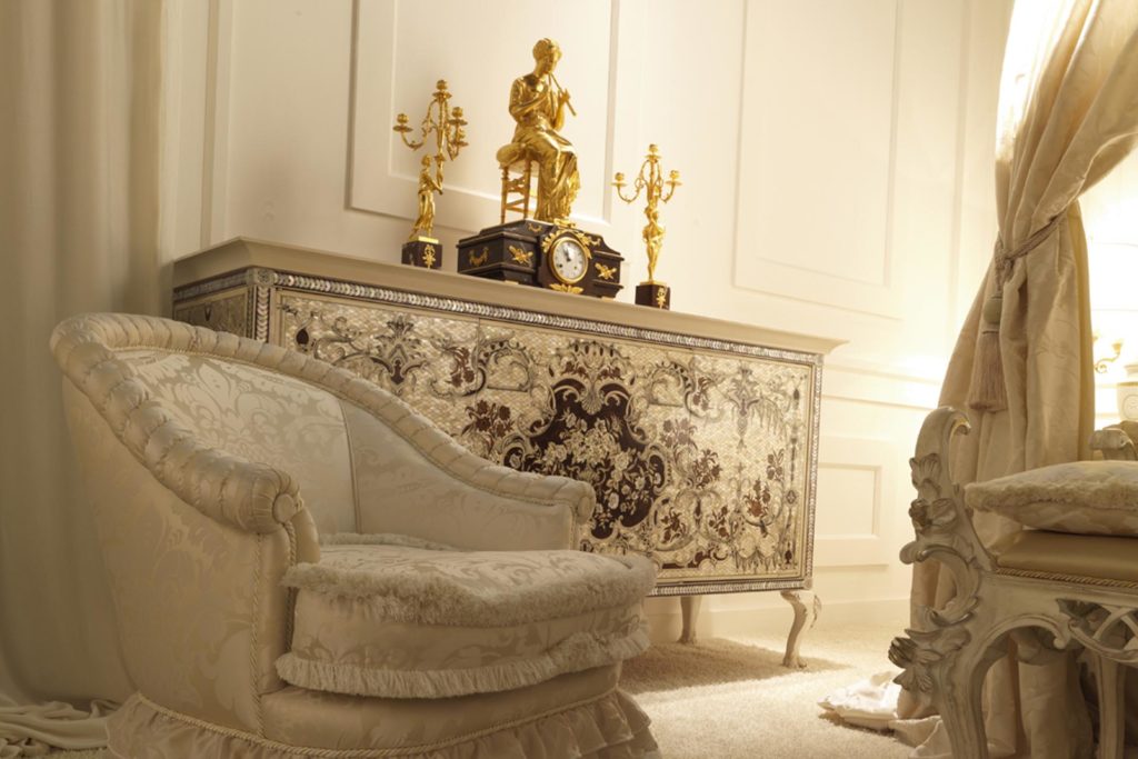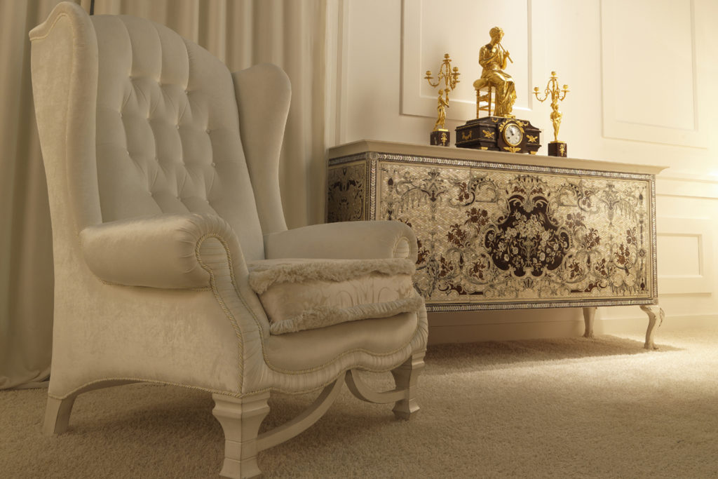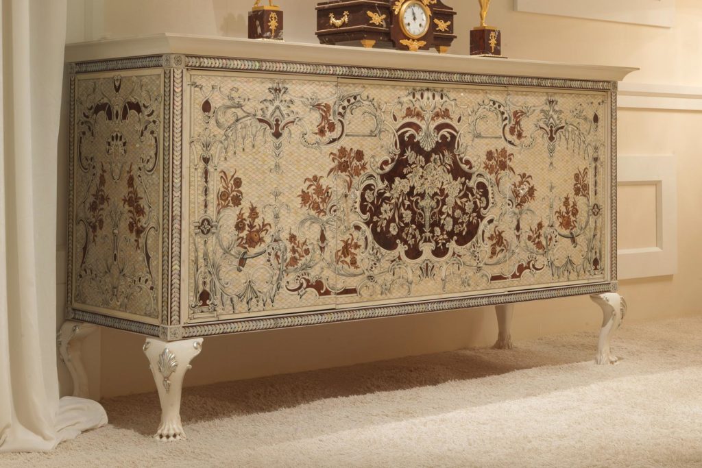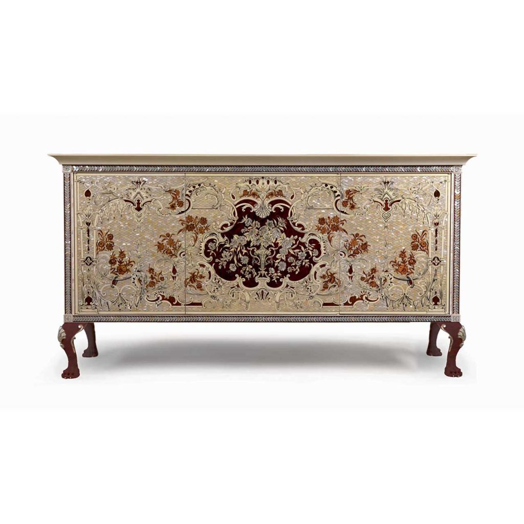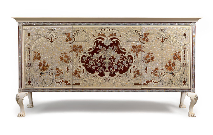 Сервант в классическом стиле, инкрустированный 16 000 кусочками австралийского перламутра, перламутровыми деталями aliothis, слоновой костью, французским шиповником Tuia, резными цветами из тисового дерева, кипариса, самшита и ПАО Марфина.