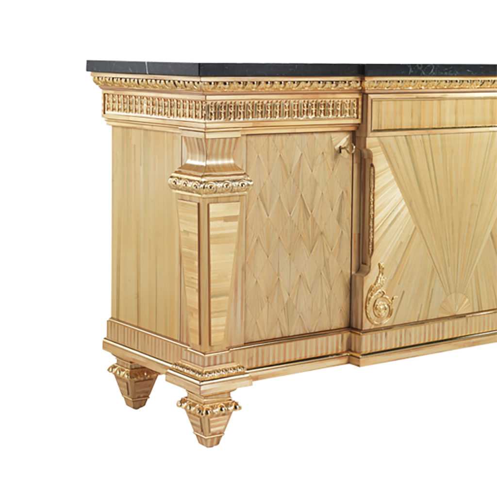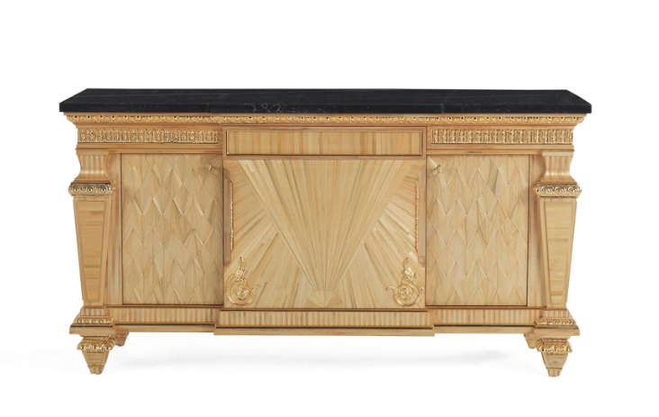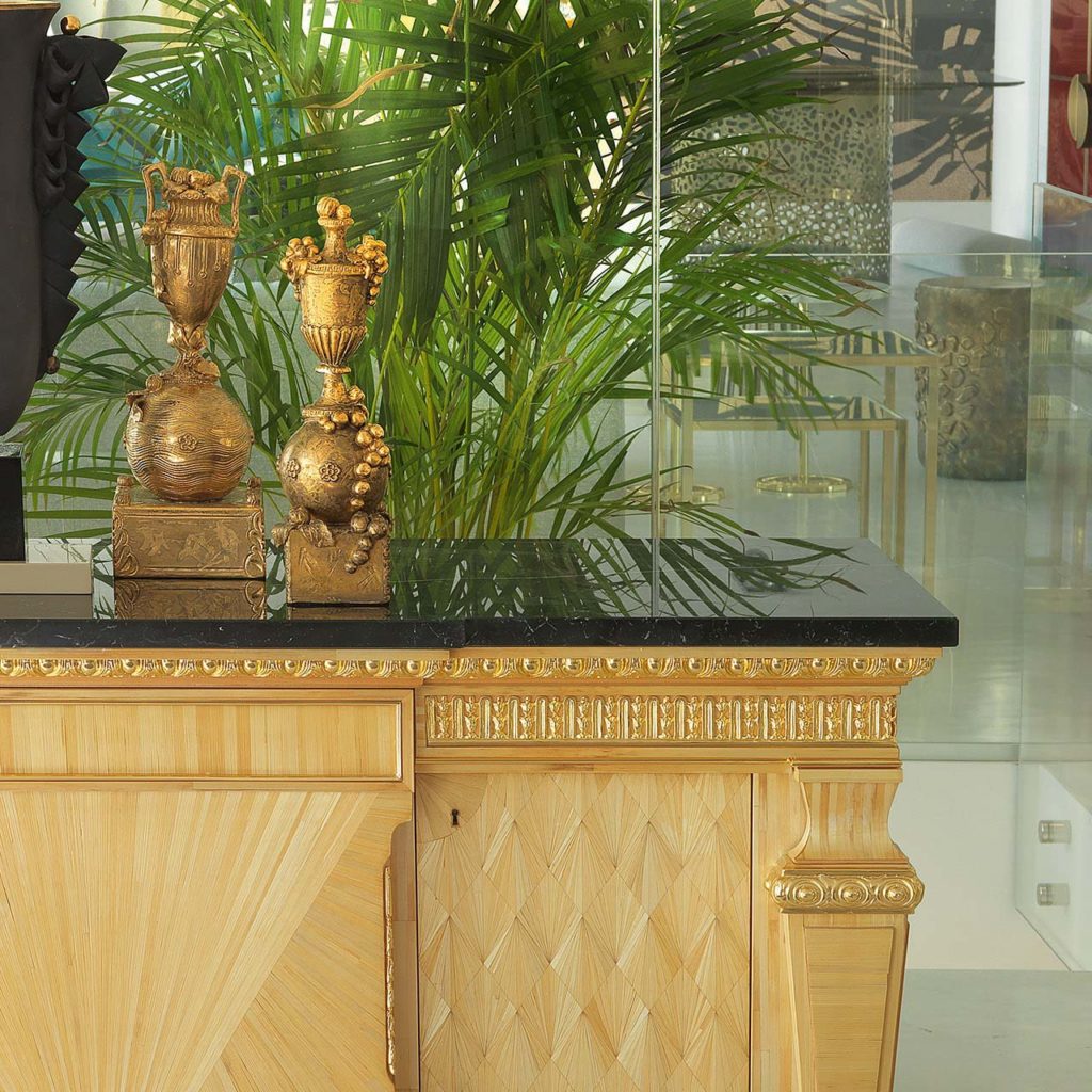 Элегантный сервант, инкрустированный натуральной соломой, с золотыми латунными элементами ванной комнаты и мраморной столешницей. Это красивая мебель, одетая с сочетаниями абсолютной элегантности, к которой мастерство дает уникальный и личный контакт.