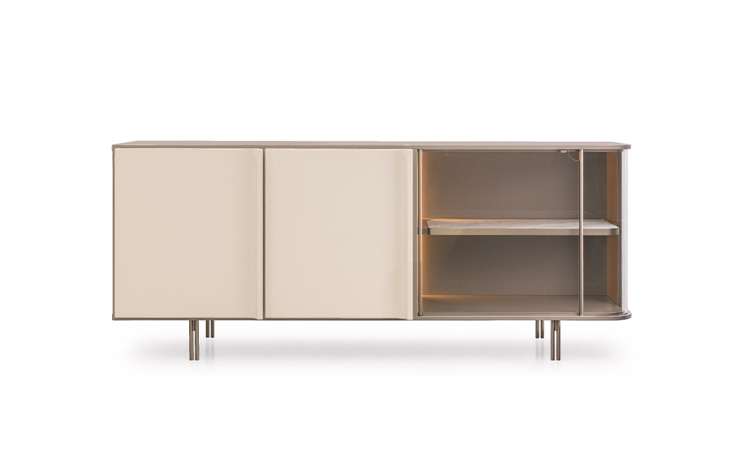 Комод Zero — это воплощение современного дизайна с отсылками к классическим канонам. Его лаконичные линии и продуманные пропорции создают ощущение легкости, а глянцевая лакированная поверхность подчеркивает глубину и благородство оттенков. Особое внимание привлекают дверцы: две из них обтянуты мягкой кожей премиум-класса, а третья — стеклянная, открывающая взгляду внутреннее пространство с мраморной полкой. Такой дизайн не только функционален, но и добавляет интерьеру утонченной респектабельности.