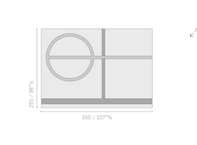 У Billie строгий, почти конструктивистский дизайн, который занимает большую часть поверхности ковра. Графика, на первый взгляд, простая, она состоит из нескольких элементов, тщательно выверенных до мельчайших деталей. Всего два рисунка на нейтральном фоне: один ярко-красный, образованный кругом и вертикальной линией, а другой — антрацитово-угольно-серый, состоящий из двух перпендикулярных линий. В результате получился ковер с четким формальным балансом и заметным визуальным эффектом. Чтобы соблюсти оригинальный дизайн и пропорции, Billie выпускается только в одном размере, 250Х350 см, и в одном цветовом варианте. Модель дополнена шерстяной отделкой ручной работы со всех четырех сторон.