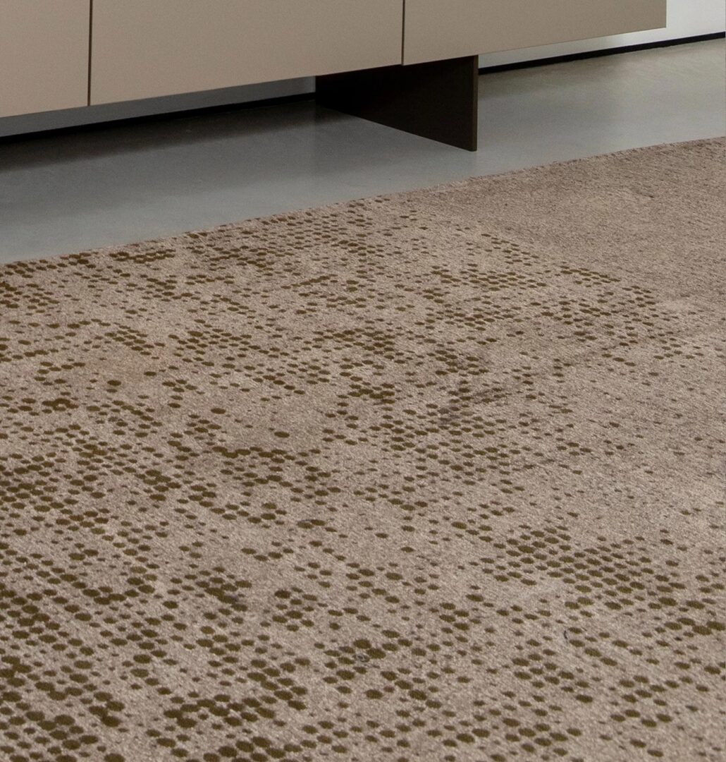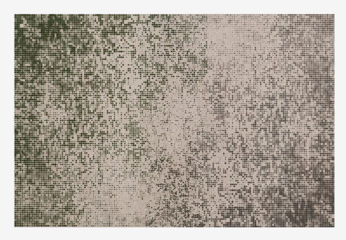 Жаккардовый ковер, выполненный из хлопка и синели с особой текстурой пиксельного эффекта, доступен в различных размерах и в серо-синих и бежево-зеленых цветовых вариантах.