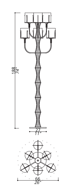 Центральная композиция состоит из изогнутых элементов из шпонированного черного дерева, широкие изогнутые подлокотники которых заканчиваются алюминиевыми вилками, удерживающими абажуры.