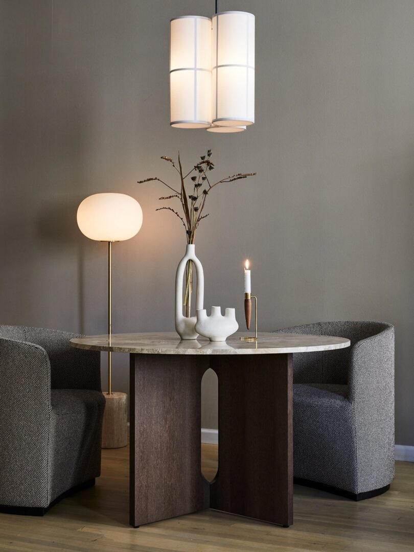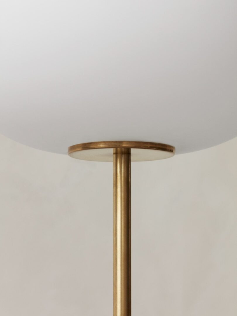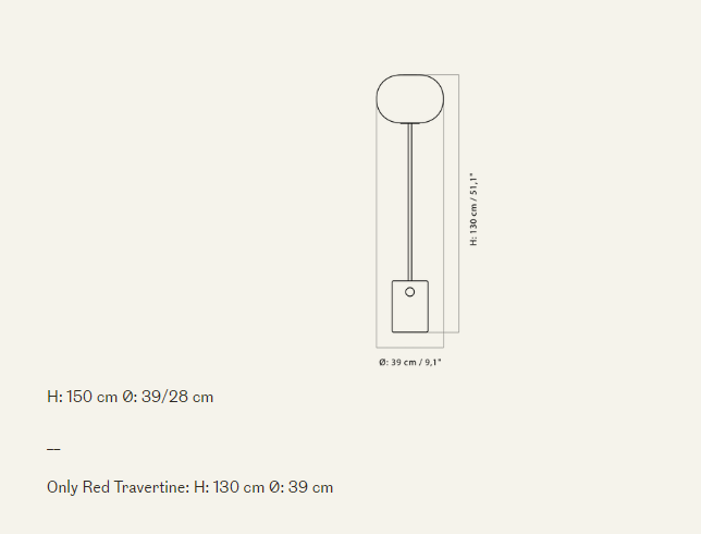 Абажур, установленный на ножке из стали с порошковым покрытием или цельной латуни, выполнен из опалового стекла эллиптической формы, в то время как основание сохраняет свою характерную округлую форму и может быть выполнено из двух видов мрамора или красного травертина, каждый из которых имеет уникальные прожилки. Матовый или бронзовый латунный регулятор яркости позволяет регулировать яркость лампы накаливания – для чтения, отдыха или просто для создания атмосферы в комнате.
