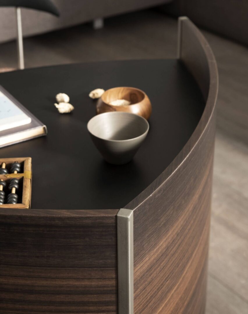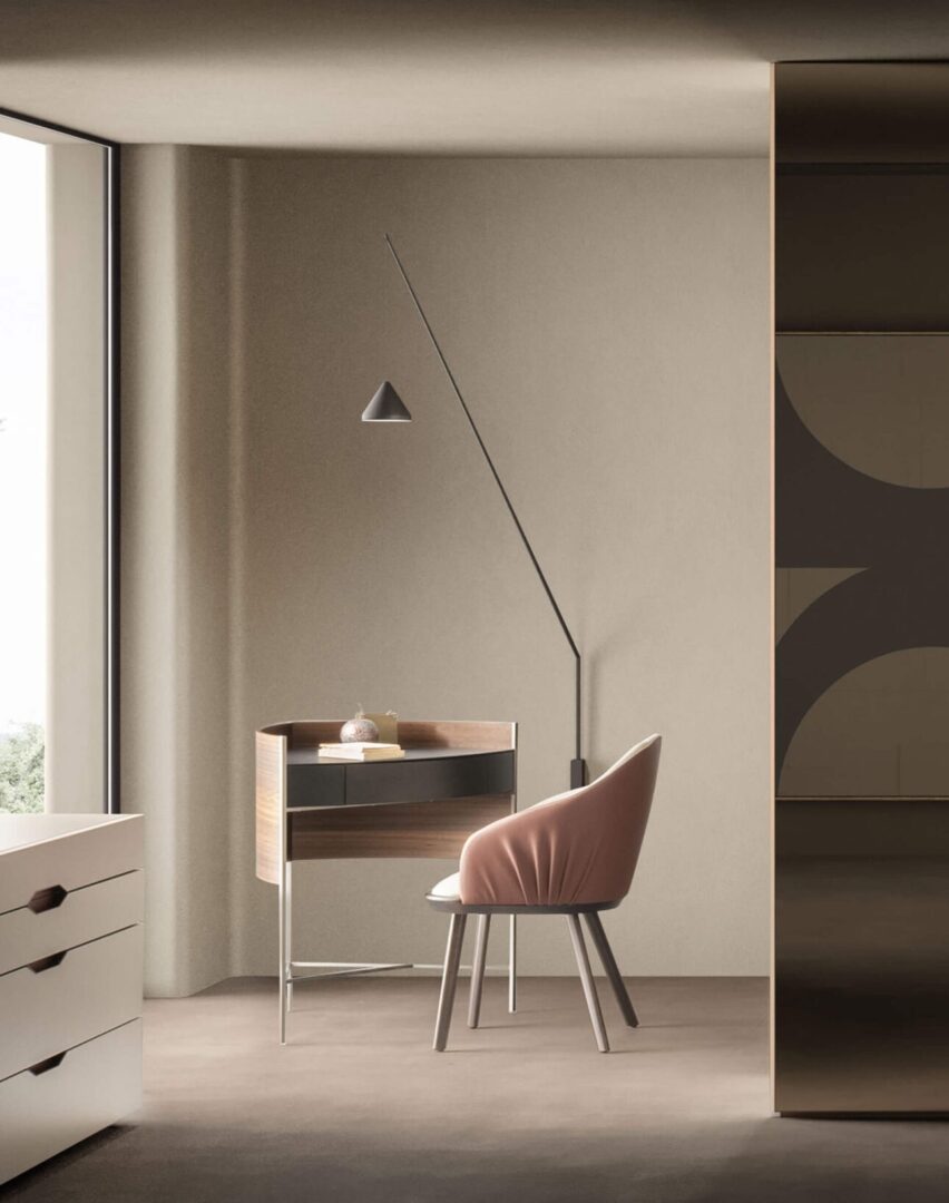 Эффектный письменный стол для домашнего офиса в форме арки со стандартной металлической конструкцией, окрашенной в оловянный цвет, опирающейся на три ножки, укрепленные горизонтальными профилями.