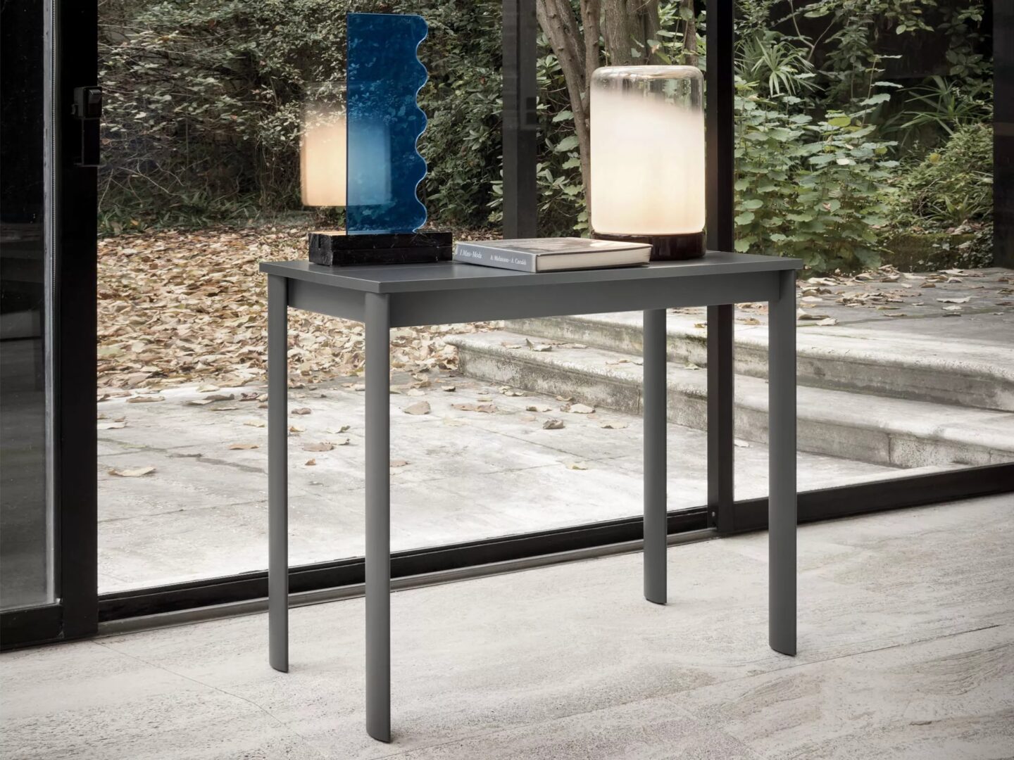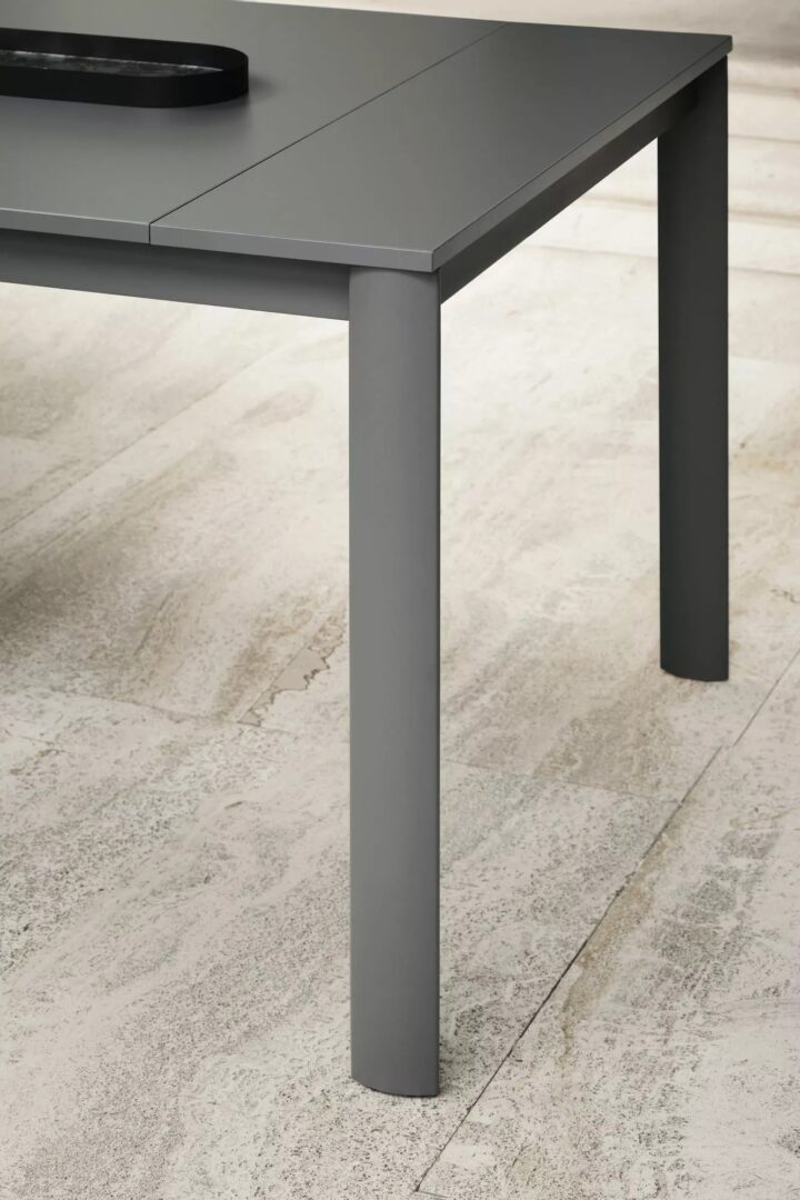 Стол-консоль со структурой из лакированной стали, столешница и раскладки из меламина.