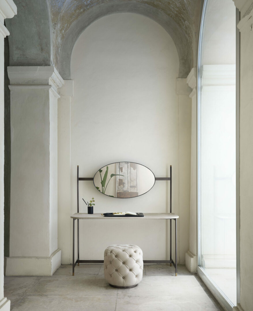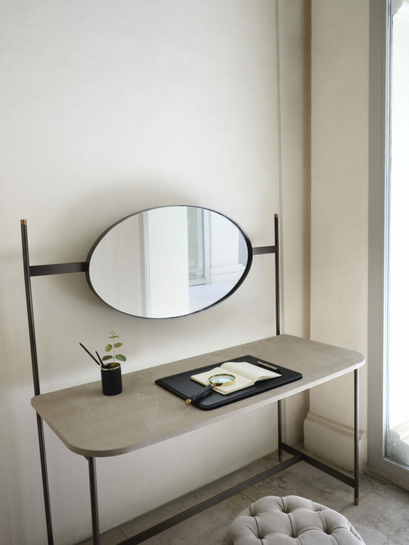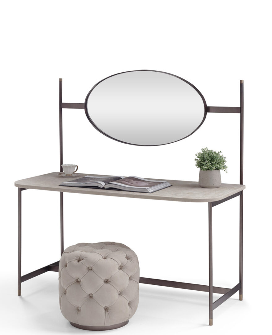 Железный письменный стол, разработанный Джо Гарзоне, отличается элегантными линиями и изящными профилями. Столешница может быть изготовлена из моющейся и устойчивой к пятнам кожи Nabuk или эко-кожи Nabuk, корпус выполнен из стали, окрашенной в антрацитовый цвет, с деталями и зеркалом из бронзовой латуни.