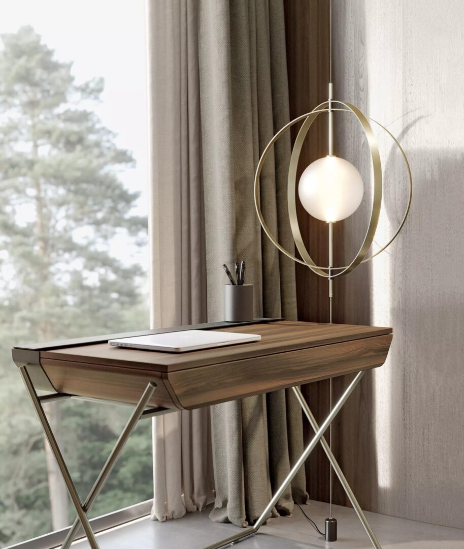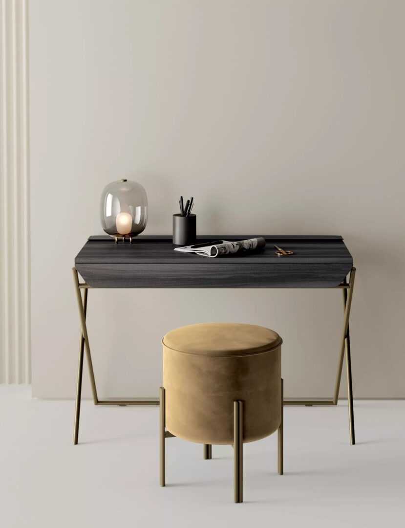 Письменный стол из лакированного стали с открываемой створкой для хранения из жёсткой кожи и со столешницей и выдвижным ящиком из шпона.