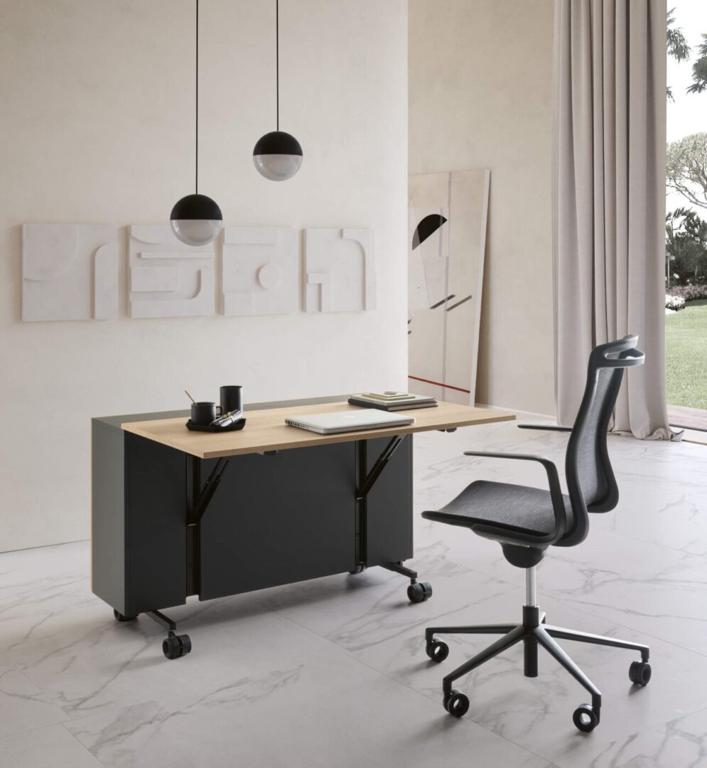 Компактный стол, ориентированный на будущее, предназначенный для домашнего офиса и удаленной работы. Стол на 4 колесах, с дверцами для хранения, отсеком для технических кабелей и дверцей для доступа к электропроводке. Откидная столешница с мягкими поршнями также доступна в электрическом исполнении sit & stand. Основание с поворотными колесиками.