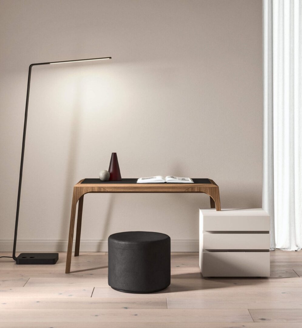 Обычный письменный стол, подходящий для личного пользования или в качестве домашнего офиса, с функциональным блоком из трех выдвижных ящиков. Конструкция выполнена из шпона натурального дерева, а столешница может быть выполнена заподлицо с деревом, гладким или матовым стеклом или керамикой, покрытыми лаком с обратной стороны. Высота столешницы 750 мм, рама может быть выполнена из темного дуба, табачного дуба или ореха Каналетто.