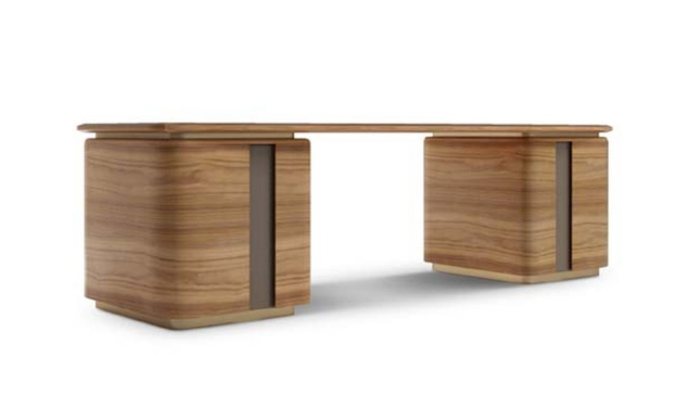 Прямоугольный деревянный стол, столешница из тамбуры, кожаные вставки, 6 ящиков.