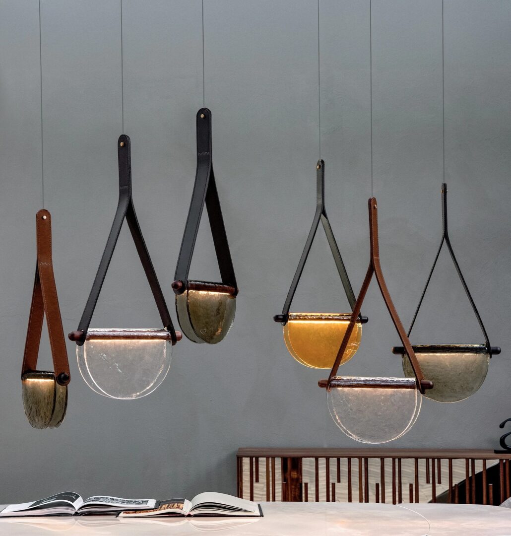 Как и часы великого художника Дали, литое стекло стекает по массивным дубовым деревянным стеблям с утопленным светодиодным светом. В подвесной версии дополнительный штрих дает настоящая кожа, которая ее поддерживает.