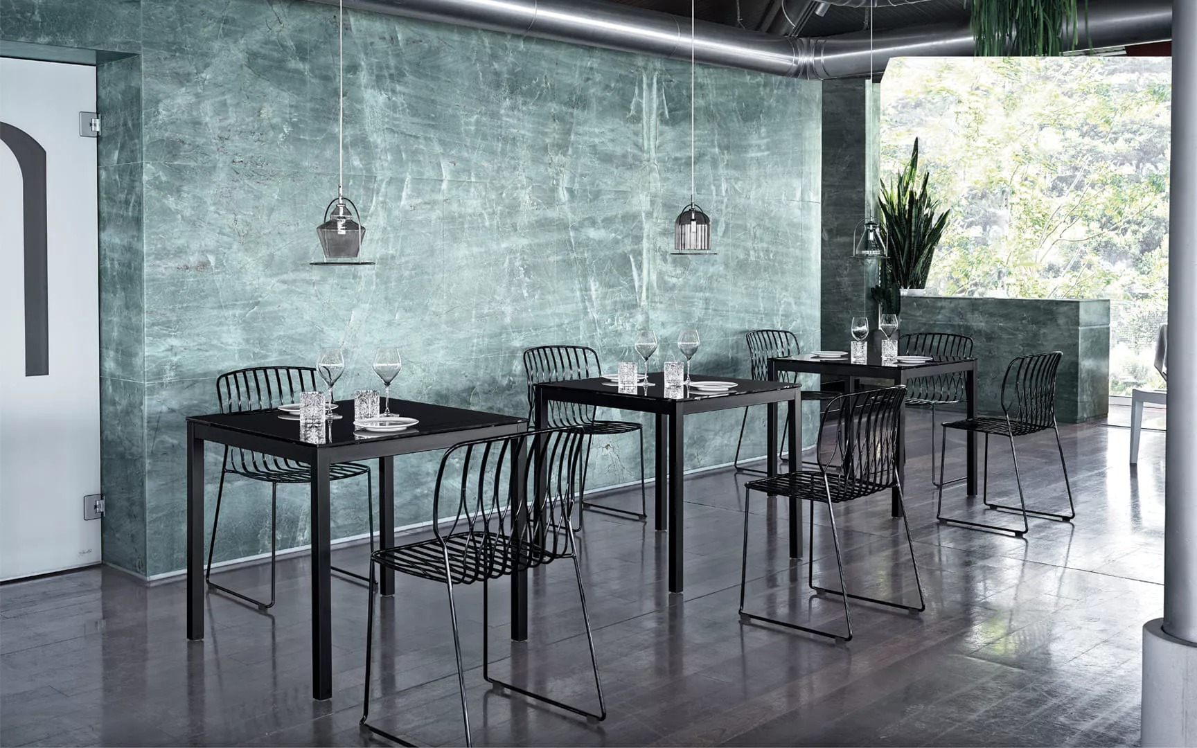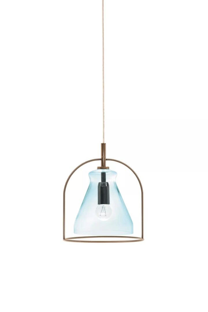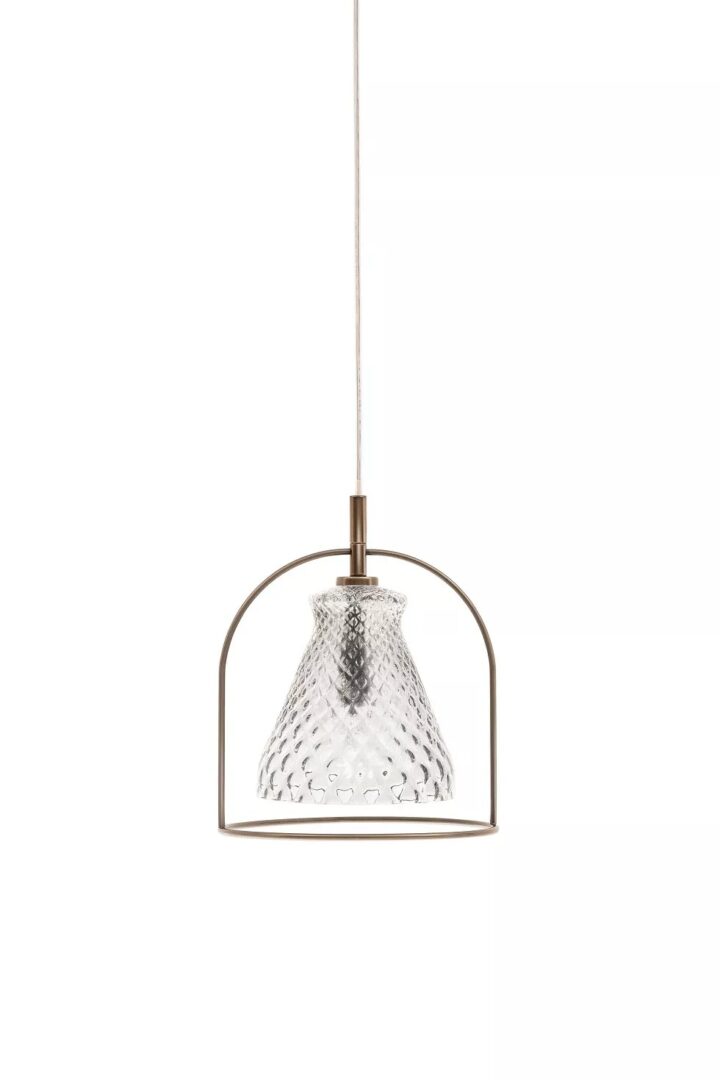 Светильник с хромированной розеткой и прозрачным кабелем. Структура из лакированной стали. Абажур из дутого стекла