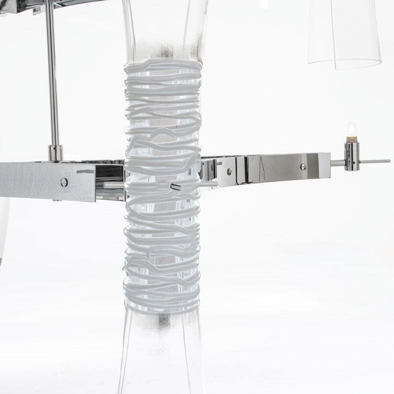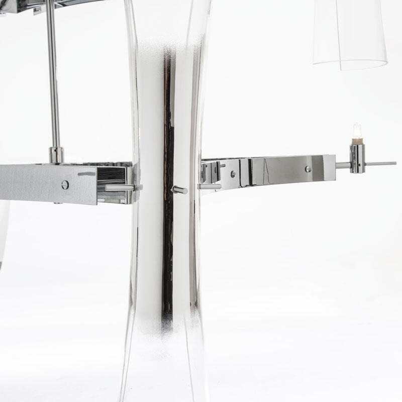 Металлическая конструкция с отделкой из старинной латуни и центральным теплым светодиодным прожектором. Каскад из 11 светильников с абажурами из муранского стекла в форме песочных часов с прозрачным литым стеклом в центре.