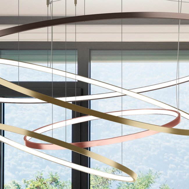 Модные подвески, светодиодные кольца propopsti в различных композиционных возможностях, творения с тонкими профилями, чтобы подчеркнуть элегантность минимального и чистого стиля. Изысканная гальваническая отделка делает алюминий ценным и уникальным, но он отодвигается на второй план, чтобы создать иллюзию для наблюдателя, что только свет должен иметь все внимание.