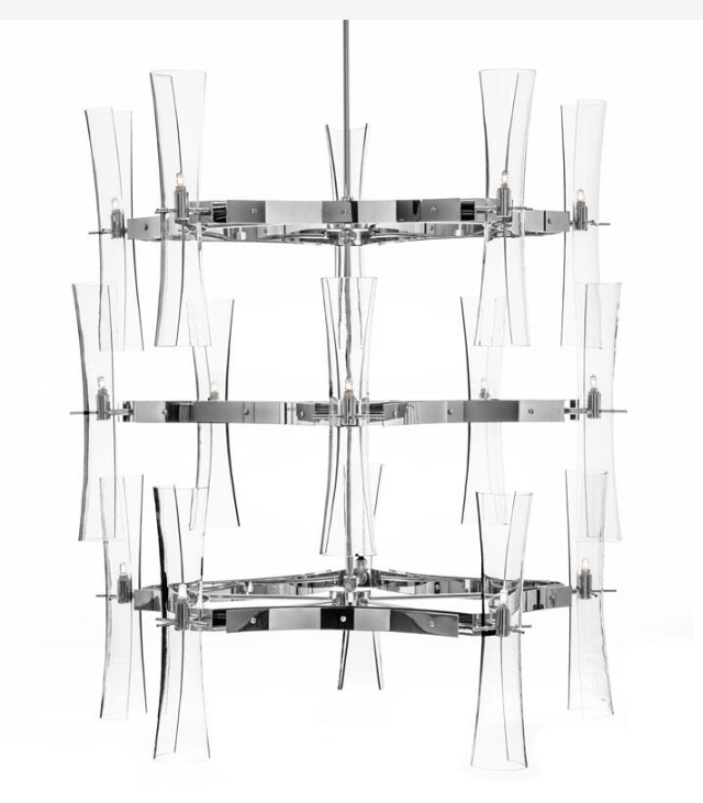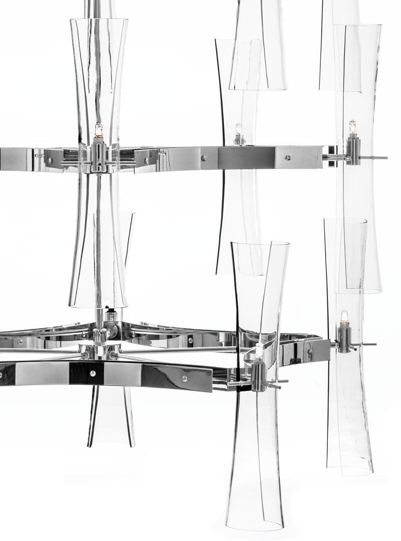 Металлическая конструкция пятиугольной формы с блестящим хромированным покрытием. 15 (5+5+5) светильников расположены на трех уровнях.